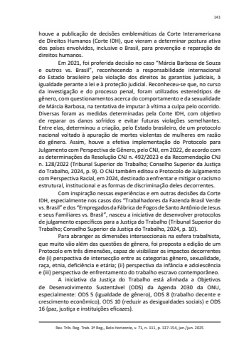 Rev. Trib. Reg. Trab. 3ª Reg., Belo Horizonte, v. 71, n. 111, p. 137-154, jan./jun. 2025141houve a publicação de decisões emblemáticas da Corte Interamericana de Direitos Humanos (Corte IDH), que vieram a determinar postura ativa dos países envolvidos, inclusive o Brasil, para prevenção e reparação de direitos humanos.Em 2021, foi proferida decisão no caso “Márcia Barbosa de Souza e outros vs. Brasil”, reconhecendo a responsabilidade internacional do Estado brasileiro pela violação dos direitos às garantias judiciais, à igualdade perante a lei e à proteção judicial. Reconheceu-se que, no curso da investigação e do processo penal, foram utilizados estereótipos de gênero, com questionamentos acerca do comportamento e da sexualidade de Márcia Barbosa, na tentativa de imputar à vítima a culpa pelo ocorrido. Diversas foram as medidas determinadas pela Corte IDH, com objetivo de reparar os danos sofridos e evitar futuras violações semelhantes. Entre elas, determinou a criação, pelo Estado brasileiro, de um protocolo nacional voltado à apuração de mortes violentas de mulheres em razão do gênero. Assim, houve a efetiva implementação do Protocolo para Julgamento com Perspectiva de Gênero, pelo CNJ, em 2022, de acordo com as determinações da Resolução CNJ n. 492/2023 e da Recomendação CNJ n. 128/2022 (Tribunal Superior do Trabalho; Conselho Superior da Justiça do Trabalho, 2024, p. 9). O CNJ também editou o Protocolo de Julgamento com Perspectiva Racial, em 2024, destinado a enfrentar e mitigar o racismo estrutural, institucional e as formas de discriminação deles decorrentes.Com inspiração nessas experiências e em outras decisões da Corte IDH, especialmente nos casos dos “Trabalhadores da Fazenda Brasil Verde vs. Brasil” e dos “Empregados da Fábrica de Fogos de Santo Antônio de Jesus e seus Familiares vs. Brasil”, nasceu a iniciativa de desenvolver protocolos de julgamento específicos para a Justiça do Trabalho (Tribunal Superior do Trabalho; Conselho Superior da Justiça do Trabalho, 2024, p. 10).Para abranger as dimensões interseccionais na esfera trabalhista, que muito vão além das questões de gênero, foi proposta a edição de um Protocolo em três dimensões, capaz de visibilizar os impactos decorrentes de (i) perspectiva de intersecção entre as categorias gênero, sexualidade, raça, etnia, deficiência e etária; (ii) perspectiva da infância e adolescência e (iii) perspectiva de enfrentamento do trabalho escravo contemporâneo.A iniciativa da Justiça do Trabalho está alinhada a Objetivos de Desenvolvimento Sustentável (ODS) da Agenda 2030 da ONU, especialmente: ODS 5 (igualdade de gênero), ODS 8 (trabalho decente e crescimento econômico), ODS 10 (reduzir as desigualdades sociais) e ODS 16 (paz, justiça e instituições eficazes).