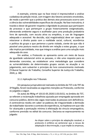 Rev. Trib. Reg. Trab. 3ª Reg., Belo Horizonte, v. 71, n. 111, p. 137-154, jan./jun. 2025144A exemplo, orienta que na fase inicial é imprescindível a análise cuidadosa da petição inicial, com triagem dos fatores sensíveis envolvidos, de modo a permitir que a prática dos demais atos processuais ocorra com a ciência das vulnerabilidades específicas da situação. Na fase instrutória, é trazido o dever de garantir respeito e dignidade às pessoas que participem do processo e que pertençam a grupo historicamente estigmatizado, oferecendo ambiente seguro e acolhedor para uma produção probatória livre de opressão, com escuta ativa ou empática, e uso de linguagem adequada e acessível. Na decisão, o(a) magistrado(a) deve ser capaz de relacionar o direito posto com a realidade social, cultural, econômica e política do grupo a que pertence a parte violada, ciente de que não é possível uma postura neutra do direito em relação a estes grupos, o que não implica parcialidade, mas que integra a análise para uma solução mais adequada do caso.Em análise, o Protocolo se apresenta como um meio de busca da igualdade substancial entre as pessoas, e não uma resposta para as demandas concretas, ao estabelecer uma metodologia que considere as vulnerabilidades de determinados grupos sociais na atuação e no julgamento, sem subverter o princípio do livre convencimento motivado (Tribunal Superior do Trabalho; Conselho Superior da Justiça do Trabalho, 2024, p. 38).3.1.1 Aplicação nos TribunaisEm pesquisa jurisprudencial realizada no âmbito do TST e do TRT da 3ª Região, foram localizadas as seguintes menções ao Protocolo, conforme os julgados a seguir.Os autos do RRAg nº 10115-05.2020.5.03.0153, no âmbito do TST, se referem a reclamação trabalhista ajuizada por empregado aprovado em concurso público, dentro das vagas reservadas às pessoas com deficiência. A controvérsia residiu em saber se padeceu de irregularidade a demissão do trabalhador durante o contrato de experiência, na hipótese em que não for alcançada a pontuação mínima à efetivação do vínculo empregatício, conforme previsão no edital do concurso. Declarou-se expressamente no julgado:Ao dispor sobre o princípio da adaptação razoável, o protocolo é enfático ao sentenciar que a recusa de adaptação é discriminação, o que impõe às empresas,