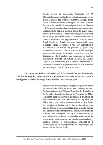 Rev. Trib. Reg. Trab. 3ª Reg., Belo Horizonte, v. 71, n. 111, p. 137-154, jan./jun. 2025149Extraio trecho do necessário Protocolo [...] “A dificuldade na consolidação do trabalho escravo como grave violação dos direitos humanos reside, entre outros fatores, na crença arraigada no senso comum de que a escravidão é uma página virada da história [...] Quanto à análise das provas contidas nos autos, especialmente sobre a postura ativa de quem julga, orienta o Protocolo [...] Por derradeiro, destaco trecho da sentença proferida pela Corte Interamericana de Direitos Humanos, no julgamento do caso Fazenda Brasil Verde vs Brasil, em que reconhecido que o Estado violou o 'direito a não ser submetido à escravidão e ao tráfico de pessoas' [...] de fato, restou demonstrado o labor em condições análogas à escravidão, já que submetido o autor a condições degradantes de trabalho, que afrontam o mínimo civilizatório previsto no artigo 7º, XVI, da CR/88. Dúvidas não restam de que o obreiro experimentou sofrimento interior e angústia diante da precariedade dessa situação laboral” (Brasil, 2025h).Os autos do ROT nº 0010318-80.2024.5.03.0070, no âmbito do TRT da 3ª Região, referiam-se a trabalho em jornada exaustiva, apta a configurar trabalho análogo à escravidão. Declarou-se que:Aplicação do Protocolo para Atuação e Julgamento com Perspectiva de Enfrentamento do Trabalho Escravo Contemporâneo, do Tribunal Superior do Trabalho e do Conselho Superior da Justiça do Trabalho, de 2024. [...] Neste caso, na primeira quinzena, o trabalho do autor foi executado por 168 horas e, na segunda, por 182 horas, o que resulta em uma média, a cada 7 dias de trabalho, de 84 horas e 91 horas. Ressaltando-se que as folgas eram concedidas apenas após quinze dias consecutivos de trabalho. 6. Restou demonstrado o labor em condições análogas à escravidão, já que submetido o Autor a jornadas extremamente extenuantes, na forma em que previsto no arcabouço jurídico interno e internacional, impondo-se a condenação da ré ao pagamento de indenização por danos morais (Brasil, 2024).