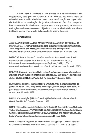 Rev. Trib. Reg. Trab. 3ª Reg., Belo Horizonte, v. 71, n. 111, p. 137-154, jan./jun. 2025152Assim, com o estímulo à sua difusão e à conscientização dos magistrados, será possível fortalecer a ferramenta, não como meio de subjetivismos e arbitrariedades, mas como reafirmação no papel ativo do Judiciário na realização da justiça substancial. Por fim, enquanto instrumento de fortalecimento do processo como garantia, se pautará a aplicação dos Protocolos com o objetivo central de efetividade, em última instância, para a concretude à dignidade da pessoa humana.REFERÊNCIASASSOCIAÇÃO NACIONAL DOS MAGISTRADOS DA JUSTIÇA DO TRABALHO (ANAMATRA). TST lança protocolos para julgamentos antidiscriminatórios.2024. Disponível em: https://www.anamatra.org.br/imprensa/noticias/35191-protocolosantidiscriminacao. Acesso em: 02 maio 2025.BARROSO, Luís Roberto. O constitucionalismo democrático no Brasil: crônica de um sucesso imprevisto. 2023. Disponível em: https://luisrobertobarroso.com.br/wp-content/uploads/2023/11/Oconstitucionalismo-democratico-no-Brasil.pdf. Acesso em: 02 maio 2025.BADARÓ, Gustavo Henrique Righi Ivahy. Medidas cautelares alternativas à prisão preventiva: comentários aos artigos 319-350 do CPP, na redação da Lei 12.403/2011. São Paulo: Ed. Revista dos Tribunais, 2011.BOUJUKIAN, Kenarik. Neutralidade é um mito, mas a imparcialidade do juiz é um dever. 2020. Disponível em: https://www.conjur.com.br/2020-jul-29/escritos-mulher-neutralidade-mito-imparcialidade-juiz-dever/. Acesso em: 15 maio 2025.BRASIL. Constituição (1988). Constituição da República Federativa do Brasil. Brasília, DF: Senado Federal, 1988.BRASIL. Tribunal Regional do Trabalho da 3ª Região (1. Turma). Recurso Ordinário Trabalhista. Processo nº ROT 0010318-80.2024.5.03.0070. Relatora: Paula Oliveira Cantelli. Publicado no DJEN em 04/12/2024. Disponível em: https://juris.trt3.jus.br/juris/consultaBaseCompleta.htm. Acesso em: 15 maio 2025.BRASIL. Tribunal Regional do Trabalho da 3ª Região (1. Turma). Recurso Ordinário Trabalhista. Processo nº ROT 0010432-21.2022.5.03.0092.