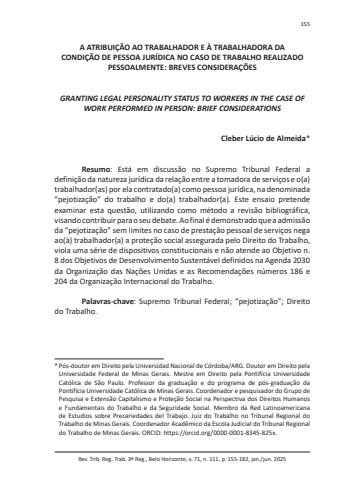 Rev. Trib. Reg. Trab. 3ª Reg., Belo Horizonte, v. 71, n. 111, p. 155-182, jan./jun. 2025155A ATRIBUIÇÃO AO TRABALHADOR E À TRABALHADORA DA CONDIÇÃO DE PESSOA JURÍDICA NO CASO DE TRABALHO REALIZADO PESSOALMENTE: BREVES CONSIDERAÇÕESGRANTING LEGAL PERSONALITY STATUS TO WORKERS IN THE CASE OF WORK PERFORMED IN PERSON: BRIEF CONSIDERATIONSCleber Lúcio de Almeida*Resumo: Está em discussão no Supremo Tribunal Federal a definição da natureza jurídica da relação entre a tomadora de serviços e o(a) trabalhador(as) por ela contratado(a) como pessoa jurídica, na denominada “pejotização” do trabalho e do(a) trabalhador(a). Este ensaio pretende examinar esta questão, utilizando como método a revisão bibliográfica, visando contribuir para o seu debate. Ao final é demonstrado que a admissão da “pejotização” sem limites no caso de prestação pessoal de serviços nega ao(à) trabalhador(a) a proteção social assegurada pelo Direito do Trabalho, viola uma série de dispositivos constitucionais e não atende ao Objetivo n. 8 dos Objetivos de Desenvolvimento Sustentável definidos na Agenda 2030 da Organização das Nações Unidas e as Recomendações números 186 e 204 da Organização Internacional do Trabalho.Palavras-chave: Supremo Tribunal Federal; “pejotização”; Direito do Trabalho.* Pós-doutor em Direito pela Universidad Nacional de Córdoba/ARG. Doutor em Direito pela Universidade Federal de Minas Gerais. Mestre em Direito pela Pontifícia Universidade Católica de São Paulo. Professor da graduação e do programa de pós-graduação da Pontifícia Universidade Católica de Minas Gerais. Coordenador e pesquisador do Grupo de Pesquisa e Extensão Capitalismo e Proteção Social na Perspectiva dos Direitos Humanos e Fundamentais do Trabalho e da Seguridade Social. Membro da Red Latinoamericana de Estudios sobre Precariedades del Trabajo. Juiz do Trabalho no Tribunal Regional do Trabalho de Minas Gerais. Coordenador Acadêmico da Escola Judicial do Tribunal Regional do Trabalho de Minas Gerais. ORCID: https://orcid.org/0000-0001-8345-825x.