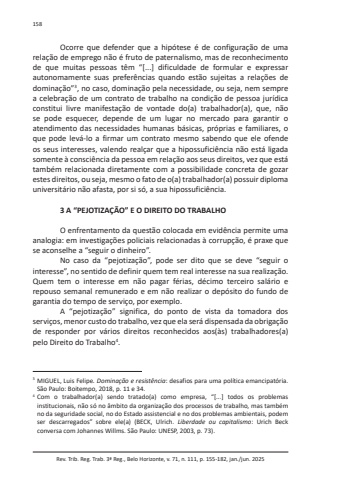 Rev. Trib. Reg. Trab. 3ª Reg., Belo Horizonte, v. 71, n. 111, p. 155-182, jan./jun. 2025158Ocorre que defender que a hipótese é de configuração de uma relação de emprego não é fruto de paternalismo, mas de reconhecimento de que muitas pessoas têm “[...] dificuldade de formular e expressar autonomamente suas preferências quando estão sujeitas a relações de dominação”3, no caso, dominação pela necessidade, ou seja, nem sempre a celebração de um contrato de trabalho na condição de pessoa jurídica constitui livre manifestação de vontade do(a) trabalhador(a), que, não se pode esquecer, depende de um lugar no mercado para garantir o atendimento das necessidades humanas básicas, próprias e familiares, o que pode levá-lo a firmar um contrato mesmo sabendo que ele ofende os seus interesses, valendo realçar que a hipossuficiência não está ligada somente à consciência da pessoa em relação aos seus direitos, vez que está também relacionada diretamente com a possibilidade concreta de gozar estes direitos, ou seja, mesmo o fato de o(a) trabalhador(a) possuir diploma universitário não afasta, por si só, a sua hipossuficiência.3 A “PEJOTIZAÇÃO” E O DIREITO DO TRABALHOO enfrentamento da questão colocada em evidência permite uma analogia: em investigações policiais relacionadas à corrupção, é praxe que se aconselhe a “seguir o dinheiro”.No caso da “pejotização”, pode ser dito que se deve “seguir o interesse”, no sentido de definir quem tem real interesse na sua realização. Quem tem o interesse em não pagar férias, décimo terceiro salário e repouso semanal remunerado e em não realizar o depósito do fundo de garantia do tempo de serviço, por exemplo.A “pejotização” significa, do ponto de vista da tomadora dos serviços, menor custo do trabalho, vez que ela será dispensada da obrigação de responder por vários direitos reconhecidos aos(às) trabalhadores(a) pelo Direito do Trabalho4.3 MIGUEL, Luis Felipe. Dominação e resistência: desafios para uma política emancipatória. São Paulo: Boitempo, 2018, p. 11 e 34.4 Com o trabalhador(a) sendo tratado(a) como empresa, “[...] todos os problemas institucionais, não só no âmbito da organização dos processos de trabalho, mas também no da seguridade social, no do Estado assistencial e no dos problemas ambientais, podem ser descarregados” sobre ele(a) (BECK, Ulrich. Liberdade ou capitalismo: Urich Beck conversa com Johannes Willms. São Paulo: UNESP, 2003, p. 73).