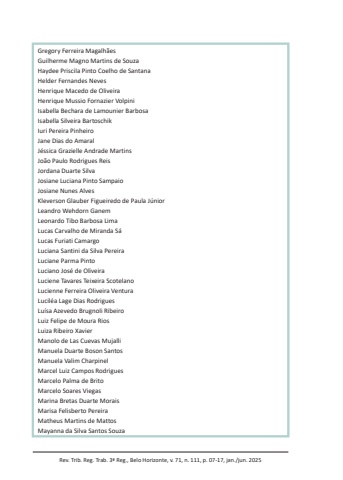 Rev. Trib. Reg. Trab. 3ª Reg., Belo Horizonte, v. 71, n. 111, p. 07-17, jan./jun. 2025Gregory Ferreira MagalhãesGuilherme Magno Martins de SouzaHaydee Priscila Pinto Coelho de SantanaHelder Fernandes NevesHenrique Macedo de OliveiraHenrique Mussio Fornazier VolpiniIsabella Bechara de Lamounier BarbosaIsabella Silveira BartoschikIuri Pereira PinheiroJane Dias do AmaralJéssica Grazielle Andrade MartinsJoão Paulo Rodrigues ReisJordana Duarte SilvaJosiane Luciana Pinto SampaioJosiane Nunes AlvesKleverson Glauber Figueiredo de Paula JúniorLeandro Wehdorn GanemLeonardo Tibo Barbosa LimaLucas Carvalho de Miranda SáLucas Furiati CamargoLuciana Santini da Silva PereiraLuciane Parma PintoLuciano José de OliveiraLuciene Tavares Teixeira ScotelanoLucienne Ferreira Oliveira VenturaLuciléa Lage Dias RodriguesLuísa Azevedo Brugnoli RibeiroLuiz Felipe de Moura RiosLuiza Ribeiro XavierManolo de Las Cuevas MujalliManuela Duarte Boson SantosManuela Valim CharpinelMarcel Luiz Campos RodriguesMarcelo Palma de BritoMarcelo Soares ViegasMarina Bretas Duarte MoraisMarisa Felisberto PereiraMatheus Martins de MattosMayanna da Silva Santos Souza