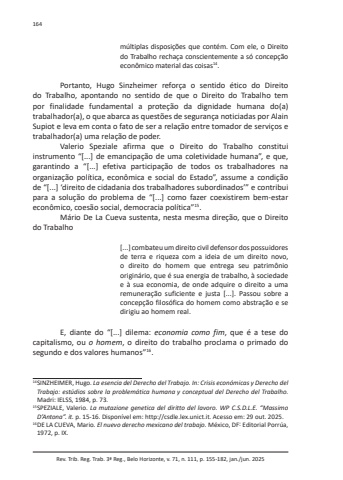 Rev. Trib. Reg. Trab. 3ª Reg., Belo Horizonte, v. 71, n. 111, p. 155-182, jan./jun. 2025164múltiplas disposições que contém. Com ele, o Direito do Trabalho rechaça conscientemente a só concepção econômico material das coisas14.Portanto, Hugo Sinzheimer reforça o sentido ético do Direito do Trabalho, apontando no sentido de que o Direito do Trabalho tem por finalidade fundamental a proteção da dignidade humana do(a) trabalhador(a), o que abarca as questões de segurança noticiadas por Alain Supiot e leva em conta o fato de ser a relação entre tomador de serviços e trabalhador(a) uma relação de poder.Valerio Speziale afirma que o Direito do Trabalho constitui instrumento “[...] de emancipação de uma coletividade humana”, e que, garantindo a “[...] efetiva participação de todos os trabalhadores na organização política, econômica e social do Estado”, assume a condição de “[...] ‘direito de cidadania dos trabalhadores subordinados’” e contribui para a solução do problema de “[...] como fazer coexistirem bem-estar econômico, coesão social, democracia política”15.Mário De La Cueva sustenta, nesta mesma direção, que o Direito do Trabalho[...] combateu um direito civil defensor dos possuidores de terra e riqueza com a ideia de um direito novo, o direito do homem que entrega seu patrimônio originário, que é sua energia de trabalho, à sociedade e à sua economia, de onde adquire o direito a uma remuneração suficiente e justa [...]. Passou sobre a concepção filosófica do homem como abstração e se dirigiu ao homem real.E, diante do “[...] dilema: economia como fim, que é a tese do capitalismo, ou o homem, o direito do trabalho proclama o primado do segundo e dos valores humanos”16.14 SINZHEIMER, Hugo. La esencia del Derecho del Trabajo. In: Crisis económicas y Derecho del Trabajo: estúdios sobre la problemática humana y conceptual del Derecho del Trabalho. Madri: IELSS, 1984, p. 73.15 SPEZIALE, Valerio. La mutazione genetica del diritto del lavoro. WP C.S.D.L.E. “Massimo D’Antona”. it. p. 15-16. Disponível em: http://csdle.lex.unict.it. Acesso em: 29 out. 2025. 16 DE LA CUEVA, Mario. El nuevo derecho mexicano del trabajo. México, DF: Editorial Porrúa, 1972, p. IX.