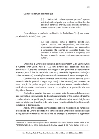 Rev. Trib. Reg. Trab. 3ª Reg., Belo Horizonte, v. 71, n. 111, p. 155-182, jan./jun. 2025165Gustav Radbruch assinala que[...] o direito civil conhece apenas ‘pessoas’, apenas sujeitos jurídicos iguais, que por livre e mútua decisão celebram contratos entre si, não o trabalhador em sua inferioridade de poder diante do empresário.E conclui que a essência do Direito do Trabalho é “[...] sua maior proximidade à vida”, visto que[...] não enxerga, como o abstrato direito civil, apenas pessoas, mas empresários, trabalhadores, empregados; não apenas indivíduos, mas associações e empresas; não apenas os contratos livres, mas também as difíceis lutas econômicas de poder, que formam o cenário desses contratos aparentemente livres17.Em suma, o Direito do Trabalho, como assinalam C. H. Camerlynck e Gérard Lyon-Caen, não é “[...] um direito das essências mas das existências”18, ele não considera as categorias em igualdade e liberdade em abstrato, mas à luz da realidade concreta, que é de dependência dos(as) trabalhadores(as) em relação ao mercado e seu condicionamento por ele.Combinados os apontamentos doutrinários citados, tem-se que a necessidade de garantir a segurança do(a) trabalhador(a), no contexto de uma relação de poder na qual se insere ao firmar o contrato de trabalho, está diretamente relacionada com a promoção e a proteção da sua dignidade humana.Contudo, é preciso dar mais um passo adiante, na medida em que, por exemplo, a coletivização da disciplina da relação entre capital e trabalho conduz à ideia de participação dos(as) trabalhadores(as) na definição das suas condições de trabalho e de vida, o que remete à ideia de justiça social, cidadania e democracia.Assim, em resposta às indagações sobre a finalidade, as funções e a utilidade do Direito do Trabalho, tem-se que: o Direito do Trabalho surgiu e se justifica em razão da necessidade de proteger e promover a dignidade 17 RADBRUCH, Gustav. Introdução à ciência do direito. São Paulo: Martins Fontes, 1999, p. 98. 18 CAMERLYNCK, C. H.; LYON-CAEN, Gérard. Droit du travail. 3. éd. Paris: Dalloz, 1969, p. 3.