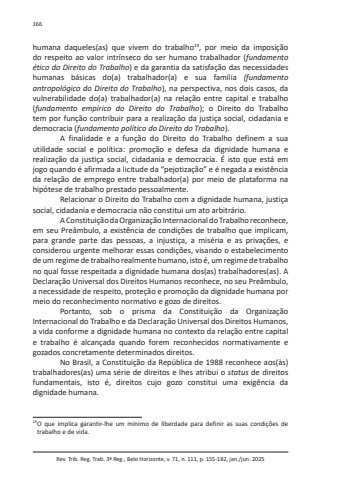 Rev. Trib. Reg. Trab. 3ª Reg., Belo Horizonte, v. 71, n. 111, p. 155-182, jan./jun. 2025166humana daqueles(as) que vivem do trabalho19, por meio da imposição do respeito ao valor intrínseco do ser humano trabalhador (fundamento ético do Direito do Trabalho) e da garantia da satisfação das necessidades humanas básicas do(a) trabalhador(a) e sua família (fundamento antropológico do Direito do Trabalho), na perspectiva, nos dois casos, da vulnerabilidade do(a) trabalhador(a) na relação entre capital e trabalho (fundamento empírico do Direito do Trabalho); o Direito do Trabalho tem por função contribuir para a realização da justiça social, cidadania e democracia (fundamento político do Direito do Trabalho).A finalidade e a função do Direito do Trabalho definem a sua utilidade social e política: promoção e defesa da dignidade humana e realização da justiça social, cidadania e democracia. É isto que está em jogo quando é afirmada a licitude da “pejotização” e é negada a existência da relação de emprego entre trabalhador(a) por meio de plataforma na hipótese de trabalho prestado pessoalmente.Relacionar o Direito do Trabalho com a dignidade humana, justiça social, cidadania e democracia não constitui um ato arbitrário.A Constituição da Organização Internacional do Trabalho reconhece, em seu Preâmbulo, a existência de condições de trabalho que implicam, para grande parte das pessoas, a injustiça, a miséria e as privações, e considerou urgente melhorar essas condições, visando o estabelecimento de um regime de trabalho realmente humano, isto é, um regime de trabalho no qual fosse respeitada a dignidade humana dos(as) trabalhadores(as). A Declaração Universal dos Direitos Humanos reconhece, no seu Preâmbulo, a necessidade de respeito, proteção e promoção da dignidade humana por meio do reconhecimento normativo e gozo de direitos.Portanto, sob o prisma da Constituição da Organização Internacional do Trabalho e da Declaração Universal dos Direitos Humanos, a vida conforme a dignidade humana no contexto da relação entre capital e trabalho é alcançada quando forem reconhecidos normativamente e gozados concretamente determinados direitos.No Brasil, a Constituição da República de 1988 reconhece aos(às) trabalhadores(as) uma série de direitos e lhes atribui o status de direitos fundamentais, isto é, direitos cujo gozo constitui uma exigência da dignidade humana.19 O que implica garantir-lhe um mínimo de liberdade para definir as suas condições de trabalho e de vida.