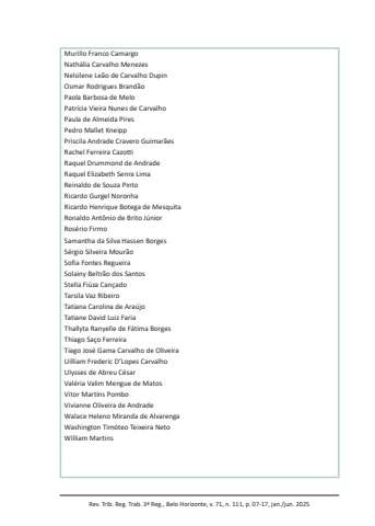 Rev. Trib. Reg. Trab. 3ª Reg., Belo Horizonte, v. 71, n. 111, p. 07-17, jan./jun. 2025Murillo Franco CamargoNathália Carvalho MenezesNelsilene Leão de Carvalho DupinOsmar Rodrigues BrandãoPaola Barbosa de MeloPatrícia Vieira Nunes de CarvalhoPaula de Almeida PiresPedro Mallet KneippPriscila Andrade Cravero GuimarãesRachel Ferreira CazottiRaquel Drummond de AndradeRaquel Elizabeth Senra LimaReinaldo de Souza PintoRicardo Gurgel NoronhaRicardo Henrique Botega de MesquitaRonaldo Antônio de Brito JúniorRosério FirmoSamantha da Silva Hassen BorgesSérgio Silveira MourãoSofia Fontes RegueiraSolainy Beltrão dos SantosStella Fiúza CançadoTarsila Vaz RibeiroTatiana Carolina de AraújoTatiane David Luiz FariaThallyta Ranyelle de Fátima BorgesThiago Saço FerreiraTiago José Gama Carvalho de OliveiraUilliam Frederic D’Lopes CarvalhoUlysses de Abreu CésarValéria Valim Mengue de MatosVitor Martins PomboVivianne Oliveira de AndradeWalace Heleno Miranda de AlvarengaWashington Timóteo Teixeira NetoWilliam Martins