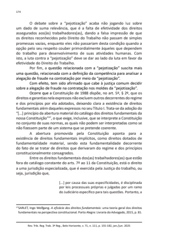 Rev. Trib. Reg. Trab. 3ª Reg., Belo Horizonte, v. 71, n. 111, p. 155-182, jan./jun. 2025174O debate sobre a “pejotização” acaba não jogando luz sobre um dado de suma relevância, que é a falta de efetividade dos direitos assegurados aos(às) trabalhadores(as), dando a falsa impressão de que os direitos reconhecidos pelo Direito do Trabalho não passam de simples promessas vazias, enquanto eles não passariam desta condição quando a opção pelo seu respeito couber primordialmente àqueles que dependem do trabalho para desenvolvimento de suas atividades humanas. Com isto, a luta contra a “pejotização” deve se dar ao lado da luta em favor da efetividade do Direito do Trabalho.Por fim, a questão relacionada com a “pejotização” suscita mais uma questão, relacionada com a definição da competência para analisar a alegação de fraude na contratação por meio da “pejotização”.Com efeito, tem sido afirmado que cabe à justiça comum decidir sobre a alegação de fraude na contratação nos moldes da “pejotização”.Ocorre que a Constituição de 1988 dispõe, no art. 5º, § 2º, que os direitos e garantias nela expressos não excluem outros decorrentes do regime e dos princípios por ela adotados, deixando clara a existência de direitos fundamentais além daqueles expressos no seu Título I. Trata-se da adoção do “[...] princípio da abertura material do catálogo dos direitos fundamentais da nossa Constituição”27, o que exige, inclusive, que se interprete a Constituição no conjunto de suas normas, as quais não podem ser interpretadas como se não fizessem parte de um sistema que se pretende coerente.A abertura promovida pela Constituição aponta para a existência de direitos fundamentais implícitos, como direitos dotados de fundamentalidade material, sendo esta fundamentalidade decorrente do fato de se tratar de direitos que derivaram do regime e dos princípios constitucionalmente consagrados.Entre os direitos fundamentais dos(as) trabalhadores(as) que estão fora do catálogo constante do arts. 7º ao 11 da Constituição, está o direito a uma jurisdição especializada, que é exercida pela Justiça do trabalho, ou seja, jurisdição que,[...] por causa das suas especificidades, é disciplinada por leis processuais próprias e julgadas por um ramo do Judiciário específico para tais questões. Portanto, a 27 SARLET, Ingo Wolfgang. A eficácia dos direitos fundamentais: uma teoria geral dos direitos fundamentais na perspectiva constitucional. Porto Alegre: Livraria do Advogado, 2015, p. 81.