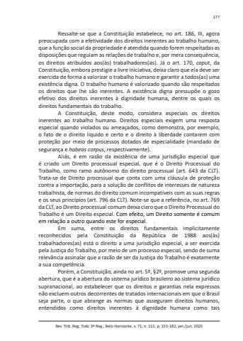 Rev. Trib. Reg. Trab. 3ª Reg., Belo Horizonte, v. 71, n. 111, p. 155-182, jan./jun. 2025177Ressalte-se que a Constituição estabelece, no art. 186, III, agora preocupada com a efetividade dos direitos inerentes ao trabalho humano, que a função social da propriedade é atendida quando forem respeitadas as disposições que regulam as relações de trabalho e, por mera consequência, os direitos atribuídos aos(às) trabalhadores(as). Já o art. 170, caput, da Constituição, embora prestigie a livre iniciativa, deixa claro que ela deve ser exercida de forma a valorizar o trabalho humano e garantir a todos(as) uma existência digna. O trabalho humano é valorizado quando são respeitados os direitos que lhe são inerentes. A existência digna pressupõe o gozo efetivo dos direitos inerentes à dignidade humana, dentre os quais os direitos fundamentais do trabalho.A Constituição, deste modo, considera especiais os direitos inerentes ao trabalho humano. Direitos especiais exigem uma resposta especial quando violados ou ameaçados, como demonstra, por exemplo, o fato de o direito líquido e certo e o direito à liberdade contarem com proteção por meio de processos dotados de especialidade (mandado de segurança e habeas corpus, respectivamente).Aliás, é em razão da existência de uma jurisdição especial que é criado um Direito processual especial, que é o Direito Processual do Trabalho, como ramo autônomo do direito processual (art. 643 da CLT). Trata-se de Direito processual que conta com uma cláusula de proteção contra a importação, para a solução de conflitos de interesses de natureza trabalhista, de normas do direito comum incompatíveis com as suas regras e os seus princípios (art. 796 da CLT). Note-se que a referência, no art. 769 da CLT, ao Direito processual comum deixa claro que o Direito Processual do Trabalho é um Direito especial. Com efeito, um Direito somente é comum em relação a outro quando este for especial.Em suma, entre os direitos fundamentais implicitamente reconhecidos pela Constituição da República de 1988 aos(às) trabalhadores(as) está o direito a uma jurisdição especial, a ser exercida pela Justiça do Trabalho, por meio de um processo especial, sendo de suma relevância assinalar que a razão de ser da Justiça do Trabalho é exatamente a sua competência.Porém, a Constituição, ainda no art. 5º, §2º, promove uma segunda abertura, que é a abertura do sistema jurídico brasileiro ao sistema jurídico supranacional, ao estabelecer que os direitos e garantias nela expressos não excluem outros decorrentes de tratados internacionais em que o Brasil seja parte, o que abrange as normas que asseguram direitos humanos, entendidos como direitos inerentes à dignidade humana como tais