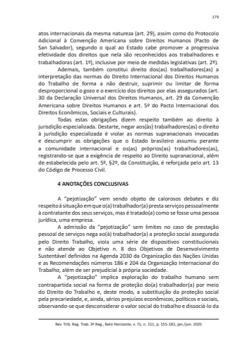Rev. Trib. Reg. Trab. 3ª Reg., Belo Horizonte, v. 71, n. 111, p. 155-182, jan./jun. 2025179atos internacionais da mesma natureza (art. 29), assim como do Protocolo Adicional à Convenção Americana sobre Direitos Humanos (Pacto de San Salvador), segundo o qual ao Estado cabe promover a progressiva efetividade dos direitos que nela são reconhecidos aos trabalhadores e trabalhadoras (art. 1º), inclusive por meio de medidas legislativas (art. 2º).Ademais, também constitui direito dos(as) trabalhadores(as) a interpretação das normas do Direito Internacional dos Direitos Humanos do Trabalho de forma a não destruir, suprimir ou limitar de forma desproporcional o gozo e o exercício dos direitos por elas assegurados (art. 30 da Declaração Universal dos Direitos Humanos, art. 29 da Convenção Americana sobre Direitos Humanos e art. 5º do Pacto Internacional dos Direitos Econômicos, Sociais e Culturais).Todas estas obrigações dizem respeito também ao direito à jurisdição especializada. Destarte, negar aos(às) trabalhadores(as) o direito à jurisdição especializada é violar as normas supranacionais invocadas e descumprir as obrigações que o Estado brasileiro assumiu perante a comunidade internacional e os(as) próprios(as) trabalhadores(as), registrando-se que a exigência de respeito ao Direito supranacional, além de estabelecida pelo art. 5º, §2º, da Constituição, é reforçada pelo art. 13 do Código de Processo Civil.4 ANOTAÇÕES CONCLUSIVASA “pejotização” vem sendo objeto de calorosos debates e diz respeito à situação em que o(a) trabalhador(a) presta serviços pessoalmente à contratante dos seus serviços, mas é tratado(a) como se fosse uma pessoa jurídica, uma empresa.A admissão da “pejotização” sem limites no caso de prestação pessoal de serviços nega ao(à) trabalhador(a) a proteção social assegurada pelo Direito Trabalho, viola uma série de dispositivos constitucionais e não atende ao Objetivo n. 8 dos Objetivos de Desenvolvimento Sustentável definidos na Agenda 2030 da Organização das Nações Unidas e as Recomendações números 186 e 204 da Organização Internacional do Trabalho, além de ser prejudicial à própria sociedade.A “pejotização” implica exploração do trabalho humano sem contrapartida social na forma de proteção do(a) trabalhador(a) por meio do Direito do Trabalho e, deste modo, a substituição da proteção social pela precariedade, e, ainda, sérios prejuízos econômicos, políticos e sociais, observando-se que desconsiderar o valor social do trabalho e dissociá-lo da