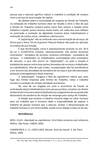 Rev. Trib. Reg. Trab. 3ª Reg., Belo Horizonte, v. 71, n. 111, p. 155-182, jan./jun. 2025180pessoa que o executa significa reduzir o trabalho à condição de simples meio a serviço da acumulação de capital.No debate sobre a necessidade de respeito ao Direito do Trabalho na utilização do trabalho humano deve ser levado a sério o fato de que o Direito do Trabalho, embora tenha como foco central a relação entre trabalho e capital, possui alcance muito maior, em razão dos seus reflexos na promoção e proteção da dignidade humana do(a) trabalhador(a) e realização da justiça social, cidadania e democracia.A “pejotização” não se confunde com a terceirização de serviços, de forma que o Tema 725 do Supremo Tribunal Federal não pode ser aplicado na análise da sua licitude.É que terceirização, como é expressamente previsto no art. 4º-A da Lei n. 6.019/1974, envolve, necessariamente, três partes (empresa contratante - tomadora de serviços, empresa contratada - prestadora de serviços - e trabalhador ou trabalhadora contratado(a) pela prestadora de serviços, o que não ocorre na “pejotização”, na qual a relação é estabelecida apenas entre duas partes (tomadora de serviços e trabalhador ou trabalhadora). Dito de outo modo, na pejotização não há transferência a um terceiro das atividades da tomadora de serviços e que são executadas pelos(as) empregados(as) desta empresa.A “pejotização” inaugura a fase do capitalismo radical que, para fugir dos limites impostos pelo Direito do Trabalho, reduz o trabalho humano à condição de simples atividade econômica.No caso de ser alegada em juízo a ocorrência de fraude na contratação do(a) trabalhador(a) como pessoa jurídica, constitui um direito fundamental e humano do(a) trabalhador(a) o julgamento da sua pretensão declaratória da existência de relação de emprego pela Justiça do Trabalho.A relação que envolve o trabalho humano exige um olhar humano para um trabalho que é humano, dada a impossibilidade de separar o trabalho da pessoa humana que o executa. Aceitar a desumanização do trabalho humano é, em certa medida, aceitá-la em relação a cada um de nós.REFERÊNCIASBECK, Ulrich. Liberdade ou capitalismo: Urich Beck conversa com Johannes Willms. São Paulo: UNESP, 2003.CAMERLYNCK, C. H.; LYON-CAEN, Gérard. Droit du travail. 3. éd. Paris: Dalloz, 1969.