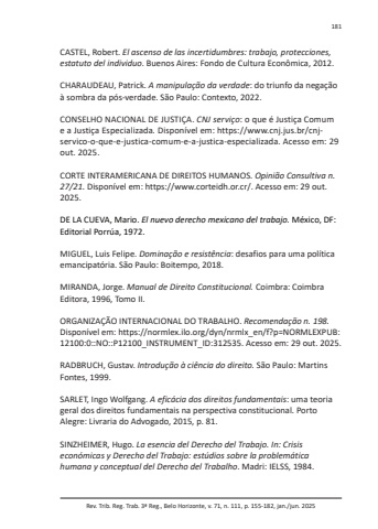Rev. Trib. Reg. Trab. 3ª Reg., Belo Horizonte, v. 71, n. 111, p. 155-182, jan./jun. 2025181CASTEL, Robert. El ascenso de las incertidumbres: trabajo, protecciones, estatuto del individuo. Buenos Aires: Fondo de Cultura Econômica, 2012.CHARAUDEAU, Patrick. A manipulação da verdade: do triunfo da negação à sombra da pós-verdade. São Paulo: Contexto, 2022.CONSELHO NACIONAL DE JUSTIÇA. CNJ serviço: o que é Justiça Comum e a Justiça Especializada. Disponível em: https://www.cnj.jus.br/cnjservico-o-que-e-justica-comum-e-a-justica-especializada. Acesso em: 29 out. 2025.CORTE INTERAMERICANA DE DIREITOS HUMANOS. Opinião Consultiva n. 27/21. Disponível em: https://www.corteidh.or.cr/. Acesso em: 29 out. 2025.DE LA CUEVA, Mario. El nuevo derecho mexicano del trabajo. México, DF: Editorial Porrúa, 1972.MIGUEL, Luis Felipe. Dominação e resistência: desafios para uma política emancipatória. São Paulo: Boitempo, 2018.MIRANDA, Jorge. Manual de Direito Constitucional. Coimbra: Coimbra Editora, 1996, Tomo II.ORGANIZAÇÃO INTERNACIONAL DO TRABALHO. Recomendação n. 198.Disponível em: https://normlex.ilo.org/dyn/nrmlx_en/f?p=NORMLEXPUB:12100:0::NO::P12100_INSTRUMENT_ID:312535. Acesso em: 29 out. 2025.RADBRUCH, Gustav. Introdução à ciência do direito. São Paulo: Martins Fontes, 1999.SARLET, Ingo Wolfgang. A eficácia dos direitos fundamentais: uma teoria geral dos direitos fundamentais na perspectiva constitucional. Porto Alegre: Livraria do Advogado, 2015, p. 81.SINZHEIMER, Hugo. La esencia del Derecho del Trabajo. In: Crisis económicas y Derecho del Trabajo: estúdios sobre la problemática humana y conceptual del Derecho del Trabalho. Madri: IELSS, 1984.