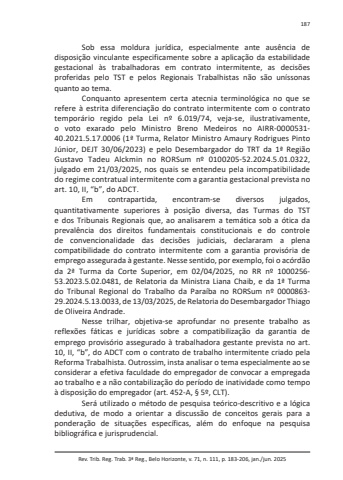 Rev. Trib. Reg. Trab. 3ª Reg., Belo Horizonte, v. 71, n. 111, p. 183-206, jan./jun. 2025187Sob essa moldura jurídica, especialmente ante ausência de disposição vinculante especificamente sobre a aplicação da estabilidade gestacional às trabalhadoras em contrato intermitente, as decisões proferidas pelo TST e pelos Regionais Trabalhistas não são uníssonas quanto ao tema.Conquanto apresentem certa atecnia terminológica no que se refere à estrita diferenciação do contrato intermitente com o contrato temporário regido pela Lei nº 6.019/74, veja-se, ilustrativamente, o voto exarado pelo Ministro Breno Medeiros no AIRR-0000531-40.2021.5.17.0006 (1ª Turma, Relator Ministro Amaury Rodrigues Pinto Júnior, DEJT 30/06/2023) e pelo Desembargador do TRT da 1ª Região Gustavo Tadeu Alckmin no RORSum nº 0100205-52.2024.5.01.0322, julgado em 21/03/2025, nos quais se entendeu pela incompatibilidade do regime contratual intermitente com a garantia gestacional prevista no art. 10, II, “b”, do ADCT.Em contrapartida, encontram-se diversos julgados, quantitativamente superiores à posição diversa, das Turmas do TST e dos Tribunais Regionais que, ao analisarem a temática sob a ótica da prevalência dos direitos fundamentais constitucionais e do controle de convencionalidade das decisões judiciais, declararam a plena compatibilidade do contrato intermitente com a garantia provisória de emprego assegurada à gestante. Nesse sentido, por exemplo, foi o acórdão da 2ª Turma da Corte Superior, em 02/04/2025, no RR nº 1000256-53.2023.5.02.0481, de Relatoria da Ministra Liana Chaib, e da 1ª Turma do Tribunal Regional do Trabalho da Paraíba no RORSum nº 0000863-29.2024.5.13.0033, de 13/03/2025, de Relatoria do Desembargador Thiago de Oliveira Andrade.Nesse trilhar, objetiva-se aprofundar no presente trabalho as reflexões fáticas e jurídicas sobre a compatibilização da garantia de emprego provisório assegurado à trabalhadora gestante prevista no art. 10, II, “b”, do ADCT com o contrato de trabalho intermitente criado pela Reforma Trabalhista. Outrossim, insta analisar o tema especialmente ao se considerar a efetiva faculdade do empregador de convocar a empregada ao trabalho e a não contabilização do período de inatividade como tempo à disposição do empregador (art. 452-A, § 5º, CLT).Será utilizado o método de pesquisa teórico-descritivo e a lógica dedutiva, de modo a orientar a discussão de conceitos gerais para a ponderação de situações específicas, além do enfoque na pesquisa bibliográfica e jurisprudencial.