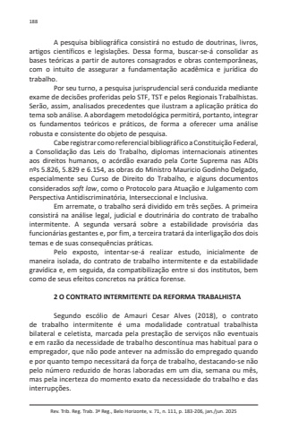 Rev. Trib. Reg. Trab. 3ª Reg., Belo Horizonte, v. 71, n. 111, p. 183-206, jan./jun. 2025188A pesquisa bibliográfica consistirá no estudo de doutrinas, livros, artigos científicos e legislações. Dessa forma, buscar-se-á consolidar as bases teóricas a partir de autores consagrados e obras contemporâneas, com o intuito de assegurar a fundamentação acadêmica e jurídica do trabalho.Por seu turno, a pesquisa jurisprudencial será conduzida mediante exame de decisões proferidas pelo STF, TST e pelos Regionais Trabalhistas. Serão, assim, analisados precedentes que ilustram a aplicação prática do tema sob análise. A abordagem metodológica permitirá, portanto, integrar os fundamentos teóricos e práticos, de forma a oferecer uma análise robusta e consistente do objeto de pesquisa.Cabe registrar como referencial bibliográfico a Constituição Federal, a Consolidação das Leis do Trabalho, diplomas internacionais atinentes aos direitos humanos, o acórdão exarado pela Corte Suprema nas ADIs nºs 5.826, 5.829 e 6.154, as obras do Ministro Mauricio Godinho Delgado, especialmente seu Curso de Direito do Trabalho, e alguns documentos considerados soft law, como o Protocolo para Atuação e Julgamento com Perspectiva Antidiscriminatória, Interseccional e Inclusiva. Em arremate, o trabalho será dividido em três seções. A primeira consistirá na análise legal, judicial e doutrinária do contrato de trabalho intermitente. A segunda versará sobre a estabilidade provisória das funcionárias gestantes e, por fim, a terceira tratará da interligação dos dois temas e de suas consequências práticas.Pelo exposto, intentar-se-á realizar estudo, inicialmente de maneira isolada, do contrato de trabalho intermitente e da estabilidade gravídica e, em seguida, da compatibilização entre si dos institutos, bem como de seus efeitos concretos na prática forense.2 O CONTRATO INTERMITENTE DA REFORMA TRABALHISTASegundo escólio de Amauri Cesar Alves (2018), o contrato de trabalho intermitente é uma modalidade contratual trabalhista bilateral e celetista, marcada pela prestação de serviços não eventuais e em razão da necessidade de trabalho descontínua mas habitual para o empregador, que não pode antever na admissão do empregado quando e por quanto tempo necessitará da força de trabalho, destacando-se não pelo número reduzido de horas laboradas em um dia, semana ou mês, mas pela incerteza do momento exato da necessidade do trabalho e das interrupções.