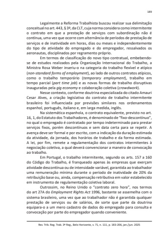 Rev. Trib. Reg. Trab. 3ª Reg., Belo Horizonte, v. 71, n. 111, p. 183-206, jan./jun. 2025189Legalmente a Reforma Trabalhista buscou realizar sua delimitação conceitual no art. 443, § 3º, da CLT, cuja norma considera como intermitente o contrato em que a prestação de serviços com subordinação não é contínua, uma vez que ocorre com alternância de períodos de prestação de serviços e de inatividade em horas, dias ou meses e independentemente do tipo de atividade do empregado e do empregador, ressalvados os aeronautas, disciplinados por regramento próprio.Em termos de classificação do novo tipo contratual, embebendose de estudos realizados pela Organização Internacional do Trabalho, a Ministra Rosa Weber inseriu-o na categoria do trabalho flexível e atípico (non-standard forms of employment), ao lado de outros contratos atípicos, como o trabalho temporário (temporary employment), trabalho em tempo parcial (part time job) e as novas formas de trabalho disruptivas inauguradas pela gig economy e colaboração coletiva (crowdwork).Nesse contexto, conforme doutrina especializada do citado Amauri Cesar Alves, a criação legislativa do contrato de trabalho intermitente brasileiro foi influenciada por previsões similares nos ordenamentos espanhol, português, italiano e, em larga medida, inglês.Na sistemática espanhola, o contrato equivalente, previsto no art. 16, 1, do Estatuto dos Trabalhadores, é denominado de “fixo-descontínuo”, no qual o empregado é contratado por tempo indeterminado para prestar serviços fixos, porém descontínuos e sem data certa para se repetir. A avença deve ser formal e por escrito, com a indicação da duração estimada da atividade, da jornada, dos horários de trabalho e da forma estimada. A lei, por fim, remete a regulamentação dos contratos intermitentes à negociação coletiva, a qual deverá convencionar a maneira de convocação ao trabalho.Em Portugal, o trabalho intermitente, segundo os arts. 157 a 160 do Código do Trabalho, é franqueado apenas às empresas que exerçam atividade descontínua ou de intensidade variável, garantida ao trabalhador uma remuneração mínima durante o período de inatividade de 20% da retribuição base ou, ainda, compensação retributiva em valor estabelecido em instrumento de regulamentação coletiva laboral.Outrossim, no Reino Unido o “contrato zero hora”, nos termos do art 27A do Employment Rights Act 1996, bastante se assemelha com o sistema brasileiro, uma vez que ao trabalhador não é garantida qualquer prestação de serviços ou de salários, de sorte que parte da doutrina equipara-o a um mero cadastro de dados do empregado para consulta e convocação por parte do empregador quando conveniente.