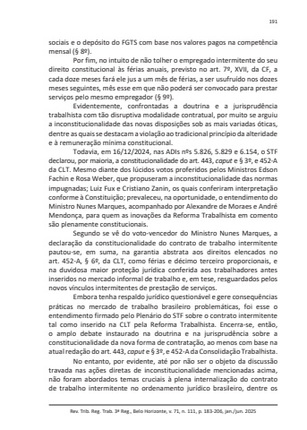 Rev. Trib. Reg. Trab. 3ª Reg., Belo Horizonte, v. 71, n. 111, p. 183-206, jan./jun. 2025191sociais e o depósito do FGTS com base nos valores pagos na competência mensal (§ 8º).Por fim, no intuito de não tolher o empregado intermitente do seu direito constitucional às férias anuais, previsto no art. 7º, XVII, da CF, a cada doze meses fará ele jus a um mês de férias, a ser usufruído nos dozes meses seguintes, mês esse em que não poderá ser convocado para prestar serviços pelo mesmo empregador (§ 9º).Evidentemente, confrontadas a doutrina e a jurisprudência trabalhista com tão disruptiva modalidade contratual, por muito se arguiu a inconstitucionalidade das novas disposições sob as mais variadas óticas, dentre as quais se destacam a violação ao tradicional princípio da alteridade e à remuneração mínima constitucional.Todavia, em 16/12/2024, nas ADIs nºs 5.826, 5.829 e 6.154, o STF declarou, por maioria, a constitucionalidade do art. 443, caput e § 3º, e 452-A da CLT. Mesmo diante dos lúcidos votos proferidos pelos Ministros Edson Fachin e Rosa Weber, que propuseram a inconstitucionalidade das normas impugnadas; Luiz Fux e Cristiano Zanin, os quais conferiram interpretação conforme à Constituição; prevaleceu, na oportunidade, o entendimento do Ministro Nunes Marques, acompanhado por Alexandre de Moraes e André Mendonça, para quem as inovações da Reforma Trabalhista em comento são plenamente constitucionais.Segundo se vê do voto-vencedor do Ministro Nunes Marques, a declaração da constitucionalidade do contrato de trabalho intermitente pautou-se, em suma, na garantia abstrata aos direitos elencados no art. 452-A, § 6º, da CLT, como férias e décimo terceiro proporcionais, e na duvidosa maior proteção jurídica conferida aos trabalhadores antes inseridos no mercado informal de trabalho e, em tese, resguardados pelos novos vínculos intermitentes de prestação de serviços.Embora tenha respaldo jurídico questionável e gere consequências práticas no mercado de trabalho brasileiro problemáticas, foi esse o entendimento firmado pelo Plenário do STF sobre o contrato intermitente tal como inserido na CLT pela Reforma Trabalhista. Encerra-se, então, o amplo debate instaurado na doutrina e na jurisprudência sobre a constitucionalidade da nova forma de contratação, ao menos com base na atual redação do art. 443, caput e § 3º, e 452-A da Consolidação Trabalhista.No entanto, por evidente, até por não ser o objeto da discussão travada nas ações diretas de inconstitucionalidade mencionadas acima, não foram abordados temas cruciais à plena internalização do contrato de trabalho intermitente no ordenamento jurídico brasileiro, dentre os