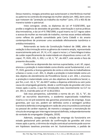 Rev. Trib. Reg. Trab. 3ª Reg., Belo Horizonte, v. 71, n. 111, p. 183-206, jan./jun. 2025193Dessa maneira, revogou preceitos que autorizavam a interferência marital ou paterna no contrato de emprego da mulher adulta (art. 446), bem como que tratavam da “proteção ao trabalho da mulher” (arts. 372 a 401-B) de maneira tutelar e patriarcal.Insta consignar, ainda, os diplomas da Lei nº 9.029/1995, que proíbe a exigência de atestados de gravidez, esterilização e outras práticas discriminatórias, e da Lei nº 9.799/1999, o qual inseriu na CLT regras sobre o acesso da mulher ao mercado de trabalho, normas essas ambas editadas como reflexo do padrão consolidado pela Carta Cidadã e do anseio contemporâneo de promover uma sociedade efetivamente isonômica e antidiscriminatória.Retornando ao texto da Constituição Federal de 1988, além da vedação à discriminação entre os gêneros de maneira ampla, representada essencialmente pelo art. 3º, IV, e 5º, caput e inciso I, o Texto Magno tratou de cuidar especificamente da maternidade em dispositivos como o art. 6º, caput, 7º, XVIII, 201, II, 203, I, e 10, II, “b”, do ADCT, este sendo o foco da presente discussão.Conforme se depreende das normas supracitadas, o art. 6º, caput, elencou a proteção à maternidade como direito social fundamental; o art. 7º, XVIII, garantiu a licença-gestante de cento e vinte dias às trabalhadoras urbanas e rurais; o art. 201, II, dispôs a proteção à maternidade como um dos objetos de atendimento da Previdência Social; o art. 203, I, enunciou a proteção à maternidade como um dos objetivos da Assistência Social; e, por fim, o art. 10, II, “b”, do ADCT vedou a dispensa arbitrária ou sem justa causa da empregada gestante, desde a confirmação da gravidez até cinco meses após o parto, o que foi introduzido mais recentemente na CLT no art. 391-A, inserido pela Lei nº 12.812/2013.Sob essa perspectiva, submetida a norma do art. 10, II, “b”, do ADCT ao escrutínio doutrinário, a academia especializada trabalhista inseriu-a no rol pré-existente das garantias provisórias de emprego. Essas garantias, por sua vez, podem ser definidas como a vantagem jurídica transitória deferida à empregada em razão de uma circunstância contratual ou pessoal de caráter especial, de maneira a assegurar a manutenção do vínculo de emprego por interregno temporal definido, independentemente da vontade do empregador (Delgado, 2019).Ademais, assegurada a relação de emprego da funcionária em estado gestacional pelo período da confirmação da gravidez até cinco meses após o parto, o término da relação contratual somente pode ocorrer em hipóteses taxativas previstas em lei. Ilustrativamente, o pedido de