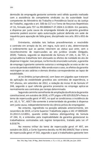 Rev. Trib. Reg. Trab. 3ª Reg., Belo Horizonte, v. 71, n. 111, p. 183-206, jan./jun. 2025194demissão da empregada gestante somente será válido quando realizado com a assistência do competente sindicato ou da autoridade local competente do Ministério do Trabalho e Previdência Social ou da Justiça do Trabalho, segundo o art. 500 da CLT e o Tema de Recursos Repetitivos nº 55, firmado pelo TST no RR-0000427-27.2024.5.12.0024. Em paralelo, a dispensa por justa causa da empregada dotada da garantia gravídica somente poderá ocorrer após autorização judicial deferida em sede de inquérito para apuração de falta grave, disciplinado nos arts. 853 a 855 da CLT.Entretanto, violadas tais balizas procedimentais e rescindido o contrato em arrepio da lei, em regra, nulo será o ato, determinando o ordenamento que as partes retornem ao status quo ante, sem o reconhecimento de repercussões ao ato jurídico viciado (Delgado, 2019). Todavia, segundo se depreende da Súmula nº 244, II, do TST, a jurisprudência trabalhista tem atenuado os efeitos da nulidade do ato de dispensa irregular. Isso porque, na forma do enunciado sumular, a garantia de emprego à gestante somente autoriza a reintegração se esta se der no curso do período estabilitário. Não sendo esse o caso, os efeitos da garantia restringem-se aos salários e demais direitos correspondentes ao lapso de estabilidade.Já no âmbito jurisprudencial, com base em julgados que trataram da aplicação da estabilidade gravídica aos contratos de experiência, o TST alterou, em setembro de 2012, a redação do inciso III da Súmula nº 244, segundo o qual referida garantia provisória no emprego aplica-se normalmente aos contratos por tempo determinado.Seguindo caminho semelhante de ampliação da eficácia da garantia constitucional, em outubro de 2018, o STF julgou o RE 629.053/SP e fixou o tema de repercussão geral nº 497, no qual se condicionou a incidência do art. 10, II, “b”, ADCT tão-somente à anterioridade da gravidez à dispensa sem justa causa, independentemente da ciência prévia do empregador.No entanto, regredindo na posição adotada anteriormente, em novembro de 2019, a Corte Superior Trabalhista julgou o IAC nº 0005639-31.2013.5.12.0051, quando então realizou distinguishing da Súmula nº 244, III, e entendeu pela inaplicabilidade da garantia gestacional às trabalhadoras contratadas sob regime temporário, tratado pela Lei nº 6.019/74.No mesmo trilhar do tema de repercussão geral nº 497, em outubro de 2023, a Corte Suprema decidiu no RE 842.844/SC fixar o tema de repercussão geral nº 542, segundo o qual a trabalhadora gestante tem