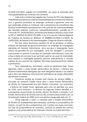 Rev. Trib. Reg. Trab. 3ª Reg., Belo Horizonte, v. 71, n. 111, p. 183-206, jan./jun. 202519652.2024.5.01.0322, julgado em 21/03/2025, nos quais se entendeu pela incompatibilidade dos institutos em comento.Lado outro, há diversos julgados das Turmas do TST e dos Regionais Trabalhistas que declaram a plena compatibilidade do contrato intermitente com a garantia provisória no emprego conferida à gestante, uma vez que analisados ambos os institutos sob a perspectiva da prevalência dos direitos fundamentais constitucionais e do controle de convencionalidade das decisões judiciais. Confira-se, exemplificativamente, acórdão da 2ª Turma do TST, de 02/04/2025, proferido pela Relatora Ministra Liana Chaib no RR nº 1000256-53.2023.5.02.0481, e da 1ª Turma do Tribunal Regional do Trabalho da Paraíba no RORSum nº 0000863-29.2024.5.13.0033, de 13/03/2025, de Relatoria do Desembargador Thiago de Oliveira Andrade.Em face dessa dicotomia, também há de se ponderar os efeitos práticos da aplicação da garantia provisória no emprego às empregadas admitidas de maneira intermitente. Uma vez que o empregador toma ciência da gravidez de sua empregada, seria ele obrigado a continuar convocando-a a prestar os serviços em períodos intermitentes? Caso não o faça e deixe de convocá-la por período superior ao usual de inatividade, seria possível à empregada gestante postular judicialmente a rescisão indireta de seu contrato de trabalho? São todos questionamentos válidos e pertinentes.Para respondê-los, entretanto, revela-se pertinente fazer breve digressão sobre o atual Estado Democrático de Direito, a eficácia dos direitos fundamentais albergados por esse ideograma estatal e sua análise sob a ótica dos diplomas internacionais balizadores da ampla efetividade dos direitos humanos.Conforme escólio de Arnaldo José Duarte do Amaral (2008), a transição do pretérito Estado Social para o atual Estado Democrático de Direito foi impulsionada por dois fatores marcantes: um econômico - a falência do Estado Fiscal, agravada pela crise do petróleo nos anos de 1970; outro histórico - o término da Segunda Guerra Mundial e o consequente renascimento do direito natural. No Brasil, a menção a um Estado Democrático de Direito ocorreu tão-somente pela primeira vez na Constituição Federal de 1988, já em seu pórtico inaugurado pelo art. 1º.Ainda segundo o autor, a transição para o Estado Democrático de Direito foi acompanhada pelo destaque conferido à jurisprudência de valores, na qual há claro compromisso com a justiça nos casos concretos, em face da jurisprudência de conceitos, atrelada ao estudo das normas jurídicas, e da jurisprudência de interesses, focada na análise dos fatos.