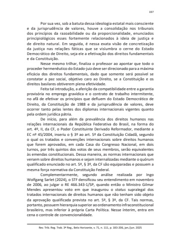 Rev. Trib. Reg. Trab. 3ª Reg., Belo Horizonte, v. 71, n. 111, p. 183-206, jan./jun. 2025197Por sua vez, sob a batuta dessa ideologia estatal mais consciente e da jurisprudência de valores, houve a consolidação nos tribunais dos princípios da razoabilidade ou da proporcionalidade, enunciados principiológicos esses fortemente relacionados à ideia de justiça e de direito natural. Em seguida, é nessa exata visão de concretização da justiça nas relações fáticas que se vislumbra o cerne do Estado Democrático de Direito, seja ele a efetivação dos direitos fundamentais e da Constituição.Nesse mesmo trilhar, finaliza o professor ao apontar que todo o proceder hermenêutico do Estado-juiz deve ser direcionado para a máxima eficácia dos direitos fundamentais, dado que somente será possível se constatar a paz social, objetivo caro ao Direito, se a Constituição e os direitos basilares obtiverem plena efetividade.Feita tal introdução, a aferição da compatibilidade entre a garantia provisória no emprego gravídica e o contrato de trabalho intermitente, no afã de efetivar os princípios que defluem do Estado Democrático de Direito, da Constituição de 1988 e da jurisprudência de valores, deve ocorrer tanto pelas lentes dos diplomas internacionais vigentes quanto pela ordem jurídica pátria.De início, para além da prevalência dos direitos humanos nas relações internacionais da República Federativa do Brasil, na forma do art. 4º, II, da CF, o Poder Constituinte Derivado Reformador, mediante a EC nº 45/2004, inseriu o § 3º ao art. 5º da Constituição Cidadã, segundo o qual os tratados e convenções internacionais sobre direitos humanos que forem aprovados, em cada Casa do Congresso Nacional, em dois turnos, por três quintos dos votos de seus membros, serão equivalentes às emendas constitucionais. Dessa maneira, as normas internacionais que versem sobre direitos humanos e sejam internalizadas mediante o quórum qualificado enunciado no art. 5º, § 3º, da CF são equiparadas e possuem a mesma força normativa da Constituição Federal.Complementarmente, segundo análise realizada por Ingo Wolfgang Sarlet (2024), o STF densificou seu entendimento em novembro de 2006, ao julgar o RE 466.343-1/SP, quando então o Ministro Gilmar Mendes apresentou voto em que inaugurou o status supralegal dos tratados internacionais de direitos humanos que não tenham sido objeto da aprovação qualificada prevista no art. 5º, § 3º, da CF. Tais normas, portanto, possuem hierarquia superior ao ordenamento infraconstitucional brasileiro, mas inferior à própria Carta Política. Nesse ínterim, entra em cena o controle de convencionalidade.