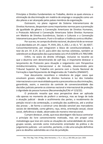 Rev. Trib. Reg. Trab. 3ª Reg., Belo Horizonte, v. 71, n. 111, p. 183-206, jan./jun. 2025199Princípios e Direitos Fundamentais no Trabalho, dentre os quais elencou a eliminação da discriminação em matéria de emprego e ocupação como um dos pilares a ser alcançado pelos países membros da organização.Outrossim, no plano regional do Sistema Interamericano de Direitos Humanos, despontam como importantes normas para a promoção da igualdade de gênero a Convenção Americana de Direitos Humanos, o Protocolo Adicional à Convenção Americana Sobre Direitos Humanos em Matéria de Direitos Econômicos, Sociais e Culturais e a Convenção Interamericana para Prevenir, Punir e Erradicar a Violência contra a Mulher.Por sua vez, no campo do direito nacional, de plano há de se renovar os já abordados art. 6º, caput, 7º, XVIII, 201, II, 203, I, e 10, II, “b”, do ADCT. Concomitantemente, por integrarem o bloco de constitucionalidade, a teor do art. 5º, § 2º, da CF, para além das normas celetistas, também se sobrelevam as disposições das supracitadas Leis nºs 9.029/95 e 9.799/1999.Enfim, na seara do direito infralegal, inclusive no tocante ao que a doutrina vem denominando de soft law, é importante destacar o lançamento do Protocolo para Atuação e Julgamento com Perspectiva Antidiscriminatória, Interseccional e de Inclusão, desenvolvido pelo Tribunal Superior do Trabalho em parceria com a Escola Nacional de Formação e Aperfeiçoamento de Magistrados do Trabalho (ENAMAT).Esse documento reconhece a relevância de julgar casos que envolvem graves violações de direitos humanos à luz dos tratados internacionais e com neutralidade quanto a preconceitos ou discriminações, garantindo, assim, o exercício do controle de convencionalidade das decisões judiciais perante os sistemas nacional e internacional de proteção à dignidade da pessoa humana (Recomendação/CNJ nº 123/22).O protocolo ressalta que essa perspectiva deve ser aplicada não apenas no momento de proferir a sentença, mas ao longo de toda a atuação judicial - desde o acolhimento das partes, o recebimento da petição inicial e da contestação, a condução das audiências, até a análise das provas -, de forma a construir uma decisão sensível aos marcadores sociais de identidade, como gênero, raça, etnia, orientação sexual, classe social, deficiência e idade, observados de maneira interseccional.Cumpre destacar, ainda, que essa abordagem não busca contrariar o princípio do livre convencimento motivado, mas sim propor uma metodologia que leve em conta as situações de vulnerabilidade de certos grupos sociais, servindo como instrumento orientador da prática e do julgamento judiciais - um caminho, portanto, e não uma solução definitiva para os desafios submetidos ao crivo da jurisdição.