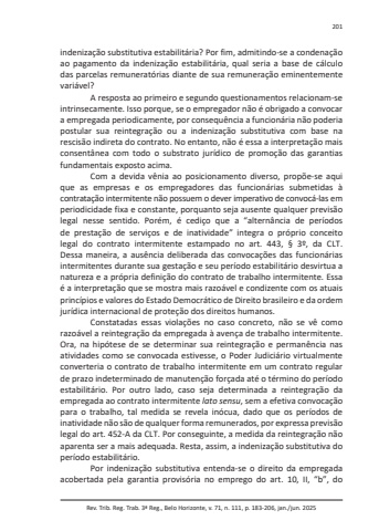 Rev. Trib. Reg. Trab. 3ª Reg., Belo Horizonte, v. 71, n. 111, p. 183-206, jan./jun. 2025201indenização substitutiva estabilitária? Por fim, admitindo-se a condenação ao pagamento da indenização estabilitária, qual seria a base de cálculo das parcelas remuneratórias diante de sua remuneração eminentemente variável?A resposta ao primeiro e segundo questionamentos relacionam-se intrinsecamente. Isso porque, se o empregador não é obrigado a convocar a empregada periodicamente, por consequência a funcionária não poderia postular sua reintegração ou a indenização substitutiva com base na rescisão indireta do contrato. No entanto, não é essa a interpretação mais consentânea com todo o substrato jurídico de promoção das garantias fundamentais exposto acima.Com a devida vênia ao posicionamento diverso, propõe-se aqui que as empresas e os empregadores das funcionárias submetidas à contratação intermitente não possuem o dever imperativo de convocá-las em periodicidade fixa e constante, porquanto seja ausente qualquer previsão legal nesse sentido. Porém, é cediço que a “alternância de períodos de prestação de serviços e de inatividade” integra o próprio conceito legal do contrato intermitente estampado no art. 443, § 3º, da CLT. Dessa maneira, a ausência deliberada das convocações das funcionárias intermitentes durante sua gestação e seu período estabilitário desvirtua a natureza e a própria definição do contrato de trabalho intermitente. Essa é a interpretação que se mostra mais razoável e condizente com os atuais princípios e valores do Estado Democrático de Direito brasileiro e da ordem jurídica internacional de proteção dos direitos humanos.Constatadas essas violações no caso concreto, não se vê como razoável a reintegração da empregada à avença de trabalho intermitente. Ora, na hipótese de se determinar sua reintegração e permanência nas atividades como se convocada estivesse, o Poder Judiciário virtualmente converteria o contrato de trabalho intermitente em um contrato regular de prazo indeterminado de manutenção forçada até o término do período estabilitário. Por outro lado, caso seja determinada a reintegração da empregada ao contrato intermitente lato sensu, sem a efetiva convocação para o trabalho, tal medida se revela inócua, dado que os períodos de inatividade não são de qualquer forma remunerados, por expressa previsão legal do art. 452-A da CLT. Por conseguinte, a medida da reintegração não aparenta ser a mais adequada. Resta, assim, a indenização substitutiva do período estabilitário.Por indenização substitutiva entenda-se o direito da empregada acobertada pela garantia provisória no emprego do art. 10, II, “b”, do