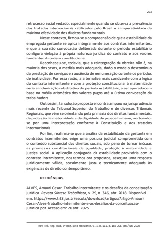Rev. Trib. Reg. Trab. 3ª Reg., Belo Horizonte, v. 71, n. 111, p. 183-206, jan./jun. 2025203retrocesso social vedado, especialmente quando se observa a prevalência dos tratados internacionais ratificados pelo Brasil e a imperatividade da máxima efetividade dos direitos fundamentais.Nesse contexto, firmou-se a compreensão de que a estabilidade da empregada gestante se aplica integralmente aos contratos intermitentes, e que a sua não convocação deliberada durante o período estabilitário configura violação à própria natureza jurídica do contrato e aos valores fundantes da ordem constitucional.Reconheceu-se, todavia, que a reintegração da obreira não é, na maioria dos casos, a medida mais adequada, dado o modelo descontínuo da prestação de serviços e a ausência de remuneração durante os períodos de inatividade. Por essa razão, a alternativa mais condizente com a lógica do contrato intermitente e com a proteção constitucional à maternidade seria a indenização substitutiva do período estabilitário, a ser apurada com base na média aritmética dos valores pagos até a última convocação da trabalhadora.Outrossim, tal solução proposta encontra amparo na jurisprudência mais recente do Tribunal Superior do Trabalho e de diversos Tribunais Regionais, que vêm se orientando pela primazia dos direitos fundamentais, da proteção da maternidade e da dignidade da pessoa humana, norteandose por uma interpretação conforme à Constituição e aos tratados internacionais.Por fim, reafirma-se que a análise da estabilidade da gestante em contratos intermitentes exige uma postura judicial comprometida com o conteúdo substancial dos direitos sociais, sob pena de tornar inócuas as promessas constitucionais de igualdade, proteção à maternidade e justiça social. A aplicação conjugada da estabilidade provisória com o contrato intermitente, nos termos ora propostos, assegura uma resposta juridicamente válida, socialmente justa e tecnicamente adequada às exigências do direito contemporâneo.REFERÊNCIASALVES, Amauri Cesar. Trabalho intermitente e os desafios da conceituação jurídica. Revista Síntese Trabalhista, v. 29, n. 346, abr. 2018. Disponível em: https://www.trt3.jus.br/escola/download/artigos/Artigo-AmauriCesar-Alves-Trabalho-intermitente-e-os-desafios-da-conceituacaojuridica.pdf. Acesso em: 20 abr. 2025.