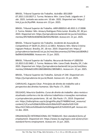 Rev. Trib. Reg. Trab. 3ª Reg., Belo Horizonte, v. 71, n. 111, p. 183-206, jan./jun. 2025205BRASIL. Tribunal Superior do Trabalho. Acórdão: 0011069-07.2021.5.03.0027.2. Turma. Relatora: Min. Liana Chaib. Julgado em: 2 abr. 2025. Juntado aos autos em: 10 abr. 2025. Disponível em: https://link.jt.jus.br/KysfNN. Acesso em: 23 jun. 2025.BRASIL. Tribunal Superior do Trabalho. AIRR-0000531-40.2021.5.17.0006. 2. Turma. Relator: Min. Amaury Rodrigues Pinto Junior. Brasília, DF, 30 jun. 2023. Disponível em: https://jurisprudencia-backend2.tst.jus.br/rest/documentos/4f5760fc9c4036f4b18ef3452f823d4. Acesso em: 21 jun. 2025.BRASIL. Tribunal Superior do Trabalho. Incidente de Assunção de Competência nº 5639-31.2013.5.12.0051. Relatora: Min. Maria Cristina Irigoyen Peduzzi. Brasília, DF, 18 nov. 2019. Disponível em: https://jurisprudencia-backend2.tst.jus.br/rest/documentos/10794e1ab18040fc28a09643364b088d. Acesso em: 21 jun. 2025.BRASIL. Tribunal Superior do Trabalho. Recurso de Revista nº 1000256-53.2023.5.02.0481. 2. Turma. Relatora: Min. Liana Chaib. Brasília, DF, 2 abr. 2025. Disponível em: https://jurisprudencia-backend2.tst.jus.br/rest/documentos/194b4a0110911060188430c23859d811. Acesso em: 22 jun. 2025.BRASIL. Tribunal Superior do Trabalho. Súmula nº 244. Disponível em: https://jurisprudencia.tst.jus.br/#void. Acesso em: 21 jun. 2025.CARVALHO, Augusto César. Princípios de direito do trabalho sob a perspectiva dos direitos humanos. São Paulo: LTr, 2018.DELGADO, Mauricio Godinho. Curso de direito do trabalho: obra revista e atualizada conforme a lei da reforma trabalhista e inovações normativas e jurisprudenciais posteriores. 18. ed. São Paulo: LTr, 2019. Disponível em: https://edisciplinas.usp.br/pluginfile.php/5746884/mod_resource/content/1/Curso%20de%20Direito%20do%20Trabalho%20-%20Mauri%CC%81cio%20Godinho%20Delgado%2C%202019.pdf. Acesso em: 11 dez. 2024.ORGANIZAÇÃO INTERNACIONAL DO TRABALHO. Non-standard forms of employment. Disponível em: https://www.ilo.org/topics-and-sectors/nonstandard-forms-employment. Acesso em: 21 jun. 2025.