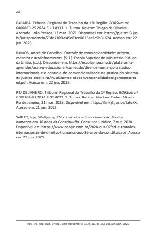Rev. Trib. Reg. Trab. 3ª Reg., Belo Horizonte, v. 71, n. 111, p. 183-206, jan./jun. 2025206PARAÍBA. Tribunal Regional do Trabalho da 13ª Região. RORSum nº 0000863-29.2024.5.13.0033. 1. Turma. Relator: Thiago de Oliveira Andrade. João Pessoa, 13 mar. 2025. Disponível em: https://pje.trt13.jus.br/jurisprudencia/73fe730f4e45e83ce0025ae3c5b31674. Acesso em: 22 jun. 2025.RAMOS, André de Carvalho. Controle de convencionalidade: origem, conceito e desdobramentos. [S. l.]: Escola Superior do Ministério Público da União, [s.d.]. Disponível em: https://escola.mpu.mp.br/plataformaaprender/acervo-educacional/conteudo/direitos-humanos-tratadosinternacionais-e-o-controle-de-convencionalidade-na-pratica-do-sistemade-justica-brasileiro/Aula5controledeconvencionalidadeorigemconceitoed.pdf. Acesso em: 22 jun. 2025.RIO DE JANEIRO. Tribunal Regional do Trabalho da 1ª Região. RORSum nº 0100205-52.2024.5.01.0322. 1. Turma. Relator: Gustavo Tadeu Alkmin. Rio de Janeiro, 21 mar. 2025. Disponível em: https://link.jt.jus.br/fa6ckX. Acesso em: 21 jun. 2025.SARLET, Ingo Wolfgang. STF e tratados internacionais de direitos humanos aos 36 anos da Constituição. Consultor Jurídico, 7 out. 2024. Disponível em: https://www.conjur.com.br/2024-out-07/stf-e-tratadosinternacionais-de-direitos-humanos-aos-36-anos-da-constituicao/. Acesso em: 22 jun. 2025.
