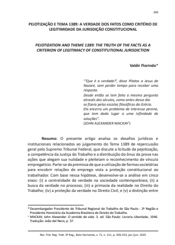 Rev. Trib. Reg. Trab. 3ª Reg., Belo Horizonte, v. 71, n. 111, p. 209-233, jan./jun. 2025209PEJOTIZAÇÃO E TEMA 1389: A VERDADE DOS FATOS COMO CRITÉRIO DE LEGITIMIDADE DA JURISDIÇÃO CONSTITUCIONALPEJOTIZATION AND THEME 1389: THE T RUTH OF THE FACTS AS A CRITERION OF LEGITIMACY OF CONSTITUTIONAL JURISDICTIONValdir Florindo*“‘Que é a verdade?’, disse Pilatos a Jesus de Nazaré, sem perder tempo para receber uma resposta.Desde então se tem feito a mesma pergunta através dos séculos, como antes desse diase fizera pelas escolas filosóficas da Grécia.Ela encerra um problema de interesse perene, que tem dado lugar a uma infinidade de soluções”.(JOHN ALEXANDER MACKAY1)Resumo: O presente artigo analisa os desafios jurídicos e institucionais relacionados ao julgamento do Tema 1389 de repercussão geral pelo Supremo Tribunal Federal, que discute a licitude da pejotização, a competência da Justiça do Trabalho e a distribuição do ônus da prova nas ações que alegam sua nulidade e pleiteiam o reconhecimento de vínculo empregatício. Parte-se da premissa de que a utilização de formas societárias para encobrir relações de emprego viola a proteção constitucional ao trabalhador. Com base nessa hipótese, desenvolve-se a análise em cinco eixos: (i) a centralidade da verdade na sociedade contemporânea; (ii) a busca da verdade no processo; (iii) a primazia da realidade no Direito do Trabalho; (iv) a proteção da verdade no Direito Civil; e (v) a distinção entre * Desembargador Presidente do Tribunal Regional do Trabalho de São Paulo - 2ª Região e Presidente Honorário da Academia Brasileira de Direito do Trabalho.1 MACKAY, John Alexander. O sentido da vida. 3. ed. São Paulo: Livraria Liberdade, 1946. Tradução: João del Nero, p. 37.