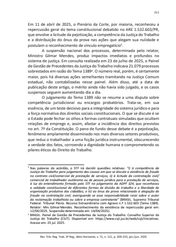 Rev. Trib. Reg. Trab. 3ª Reg., Belo Horizonte, v. 71, n. 111, p. 209-233, jan./jun. 2025211Em 11 de abril de 2025, o Plenário da Corte, por maioria, reconheceu a repercussão geral do tema constitucional debatido no ARE 1.532.603/PR, que envolve a licitude da pejotização, a competência da Justiça do Trabalho e a distribuição do ônus da prova nas ações que alegam sua nulidade e postulam o reconhecimento de vínculo empregatício3.A suspensão nacional dos processos, determinada pelo relator, Ministro Gilmar Mendes, produz impactos imediatos e profundos no sistema de justiça. Em consulta realizada em 23 de julho de 2025, o Painel de Gestão de Precedentes da Justiça do Trabalho indicava 21.079 processos sobrestados em razão do Tema 13894. O número real, porém, é certamente maior, pois há diversas ações semelhantes tramitando na Justiça Comum estadual, não contabilizadas nesse painel. Além disso, até a data de publicação deste artigo, o mérito ainda não havia sido julgado, e os casos suspensos seguem aumentando dia a dia.O julgamento do Tema 1389 não se resume a uma disputa sobre competência jurisdicional ou encargos probatórios. Trata-se, em sua essência, de um teste decisivo para a integridade do sistema jurídico e para a força normativa dos direitos sociais constitucionais. O que se discute é se o Estado pode fechar os olhos a formas contratuais simuladas que ocultam relações de emprego e, assim, afastar a incidência dos direitos previstos no art. 7º da Constituição. O pano de fundo desse debate é a pejotização, fenômeno amplamente disseminado nos mais diversos setores produtivos, que reduz o trabalhador a uma ficção jurídica instrumental, obscurecendo a verdade dos fatos, corroendo a dignidade humana e comprometendo os pilares éticos do Direito do Trabalho.3 Nas palavras do acórdão, o STF irá decidir questões relativas: “i) à competência da Justiça do Trabalho para julgamento das causas em que se discute a existência de fraude no contrato civil/comercial de prestação de serviços; ii) à licitude da contratação civil/comercial de trabalhador autônomo ou de pessoa jurídica para a prestação de serviços, à luz do entendimento firmado pelo STF no julgamento da ADPF 324, que reconheceu a validade constitucional de diferentes formas de divisão do trabalho e a liberdade de organização produtiva dos cidadãos; e iii) ao ônus da prova relacionado à alegação de fraude na contratação civil, averiguando se essa responsabilidade recai sobre o autor da reclamação trabalhista ou sobre a empresa contratante” (BRASIL. Supremo Tribunal Federal. Tribunal Pleno. Recurso Extraordinário com Agravo n.º 1.532.603 (Tema 1389). Relator: Min.GilmarMendes. Reconhecimento da existência de repercussão geral em: 12/04/2025. Suspensão determinada em: 14/04/2025).4 BRASIL. Painel de Gestão de Precedentes da Justiça do Trabalho. Conselho Superior da Justiça do Trabalho (CSJT). Disponível em: https://www.csjt.jus.br/web/csjt/iniciativas. Acesso em: 23 jul. 2025.