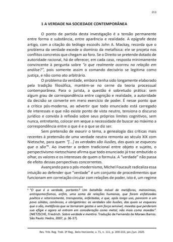 Rev. Trib. Reg. Trab. 3ª Reg., Belo Horizonte, v. 71, n. 111, p. 209-233, jan./jun. 20252131 A VERDADE NA SOCIEDADE CONTEMPORÂNEAO ponto de partida desta investigação é a tensão permanente entre forma e substância, entre aparência e realidade. A epígrafe deste artigo, com a citação do teólogo escocês John A. Mackay, recorda que o problema da verdade excede o domínio da metafísica: ele se projeta nos conflitos concretos que chegam ao foro. Se o Direito se pretende dotado de autoridade racional, há de oferecer, em cada caso, resposta minimamente convincente à pergunta sobre “o que realmente ocorreu na relação em análise?”, pois somente assim o comando decisório se legitima como justiça, e não como ato arbitrário.O problema da verdade, embora tenha sido longamente elaborado pela tradição filosófica, mantém-se no cerne da teoria processual contemporânea. Para o jurista, a questão é sobretudo prática: sem algum grau de correspondência entre cognição e realidade, a autoridade da decisão se converte em mero exercício de poder. É nesse ponto que a crítica pós-moderna, ao advertir que todo enunciado está carregado de interesses e que não existe ponto de vista neutro, tensiona o discurso jurídico e convida à reflexão sobre seus próprios limites cognitivos, sem nunca, entretanto, colocar em xeque a necessidade de buscar ao máximo a correspondência entre o que é e o que se diz ser.Sem pretensão de exaurir o tema, a genealogia das críticas mais recentes à pretensão de uma verdade neutra remonta ao século XIX com Nietzsche, para quem “[...] as verdades são ilusões, das quais se esqueceu que o são”6. Ao inverter a ordem tradicional entre objeto e sujeito, o perspectivismo nietzschiano afirma que todo enunciado já traz embutido o olhar, os valores e os interesses de quem o formula. A “verdade” não passa de efeito dessas perspectivas concorrentes.Avançando para o pós-modernismo, Michel Foucault radicaliza essa intuição ao defender que “verdade” é um conjunto de procedimentos que funcionam em correlação circular com relações de poder, isto é, um regime 6 “O que é a verdade, portanto? Um batalhão móvel de metáforas, metonímias, antropomorfismos, enfim, uma soma de relações humanas, que foram enfatizadas poética e retoricamente, transpostas, enfeitadas, e que, após longo uso, parecem a um povo sólidas, canônicas, e obrigatórias: as verdades são ilusões, das quais se esqueceu que o são, metáforas que se tornaram gastas e sem força sensível, moedas que perderam sua efígie e agora só entram em consideração como metal, não mais como moedas”.(NIETZSCHE, Friedrich. Sobre verdade e mentira. Tradução de Fernando de Moraes Barros. São Paulo: Hedra, 2007, p. 36-37).