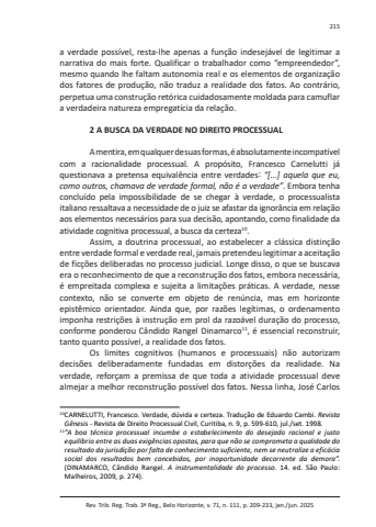 Rev. Trib. Reg. Trab. 3ª Reg., Belo Horizonte, v. 71, n. 111, p. 209-233, jan./jun. 2025215a verdade possível, resta-lhe apenas a função indesejável de legitimar a narrativa do mais forte. Qualificar o trabalhador como “empreendedor”, mesmo quando lhe faltam autonomia real e os elementos de organização dos fatores de produção, não traduz a realidade dos fatos. Ao contrário, perpetua uma construção retórica cuidadosamente moldada para camuflar a verdadeira natureza empregatícia da relação.2 A BUSCA DA VERDADE NO DIREITO PROCESSUALA mentira, em qualquer de suas formas, é absolutamente incompatível com a racionalidade processual. A propósito, Francesco Carnelutti já questionava a pretensa equivalência entre verdades: “[...] aquela que eu, como outros, chamava de verdade formal, não é a verdade”. Embora tenha concluído pela impossibilidade de se chegar à verdade, o processualista italiano ressaltava a necessidade de o juiz se afastar da ignorância em relação aos elementos necessários para sua decisão, apontando, como finalidade da atividade cognitiva processual, a busca da certeza10.Assim, a doutrina processual, ao estabelecer a clássica distinção entre verdade formal e verdade real, jamais pretendeu legitimar a aceitação de ficções deliberadas no processo judicial. Longe disso, o que se buscava era o reconhecimento de que a reconstrução dos fatos, embora necessária, é empreitada complexa e sujeita a limitações práticas. A verdade, nesse contexto, não se converte em objeto de renúncia, mas em horizonte epistêmico orientador. Ainda que, por razões legítimas, o ordenamento imponha restrições à instrução em prol da razoável duração do processo, conforme ponderou Cândido Rangel Dinamarco11, é essencial reconstruir, tanto quanto possível, a realidade dos fatos.Os limites cognitivos (humanos e processuais) não autorizam decisões deliberadamente fundadas em distorções da realidade. Na verdade, reforçam a premissa de que toda a atividade processual deve almejar a melhor reconstrução possível dos fatos. Nessa linha, José Carlos 10 CARNELUTTI, Francesco. Verdade, dúvida e certeza. Tradução de Eduardo Cambi. Revista Gênesis - Revista de Direito Processual Civil, Curitiba, n. 9, p. 599-610, jul./set. 1998. 11 “A boa técnica processual incumbe o estabelecimento do desejado racional e justo equilíbrio entre as duas exigências opostas, para que não se comprometa a qualidade do resultado da jurisdição por falta de conhecimento suficiente, nem se neutralize a eficácia social dos resultados bem concebidos, por inoportunidade decorrente da demora”.(DINAMARCO, Cândido Rangel. A instrumentalidade do processo. 14. ed. São Paulo: Malheiros, 2009, p. 274).