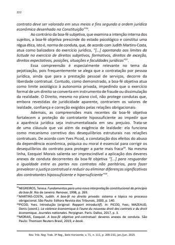 Rev. Trib. Reg. Trab. 3ª Reg., Belo Horizonte, v. 71, n. 111, p. 209-233, jan./jun. 2025222contrato deve ser valorado em seus meios e fins segundo a ordem jurídica econômica desenhada na Constituição”26.Ao contrário da boa-fé subjetiva, que examina a intenção interna dos sujeitos, a boa-fé objetiva prescinde do estado psicológico e constitui uma régua ética, isto é, norma de conduta, que, de acordo com Judith Martins-Costa, atua como balizadora do exercício jurídico, “[...] apontando aos limites da licitude no exercício de direitos subjetivos, formativos, direitos de exceção, direitos expectativos, posições, situações e faculdades jurídicas”27.Essa compreensão é especialmente relevante no tema da pejotização, pois frequentemente se alega que a contratação por pessoa jurídica, ainda que para a prestação pessoal de serviços, decorre da liberdade contratual. Contudo, como demonstrado, a boa-fé objetiva atua como limite axiológico à autonomia privada, impedindo que o exercício formal de um direito se converta em instrumento de fraude ou dissimulação da realidade. O Direito, mesmo no plano civil, não protege condutas que, embora revestidas de juridicidade aparente, contrariem os valores de lealdade, confiança e correção exigidos pelas relações obrigacionais.Ademais, as compreensões mais recentes da boa-fé objetiva fortalecem a proteção do contratante hipossuficiente ao impedir que a aparência jurídica seja instrumentalizada em seu prejuízo. Trata-se de uma cláusula que vai além da exigência de lealdade: ela funciona como mecanismo corretivo dos desequilíbrios estruturais nas relações contratuais. De acordo com Yves Picod, a constatação dos efeitos do abuso da dependência econômica, psíquica ou moral é essencial para corrigir os desequilíbrios do contrato para proteger a parte mais fraca28. Na mesma linha, Ezequiel Morais salienta ser imprescindível a aplicação dos deveres anexos de conduta decorrentes da boa-fé objetiva “[...] para resguardar a igualdade entre as partes nos contratos não paritários, para fazer prevalecer a justiça contratual e reduzir ou eliminar diferenças significativas dos contratantes hipossuficiente e hipersuficiente”29.26 NEGREIROS, Teresa. Fundamentos para uma nova interpretação constitucional do princípio da boa-fé. Rio de Janeiro: Renovar, 1998, p. 269. 27 MARTINS-COSTA, Judith. A boa-fé no direito privado: sistema e tópica no processo obrigacional. São Paulo: Editora Revista dos Tribunais, 2000, p. 140.28 PICOD, Yves. Introdução (original: Rapport introductif). In: PICOD, Yves; MAZEAUD, Denis (coord.). La violence économique à l’aune du nouveau droit des contrats e du droit économique. Journées nationales. Perpignan. Paris: Dalloz, 2017, p. 3. 29 MORAIS, Ezequiel. A boa-fé objetiva pré-contratual: deveres anexos de conduta. São Paulo: Thomson Reuters Brasil, 2019, e-book.