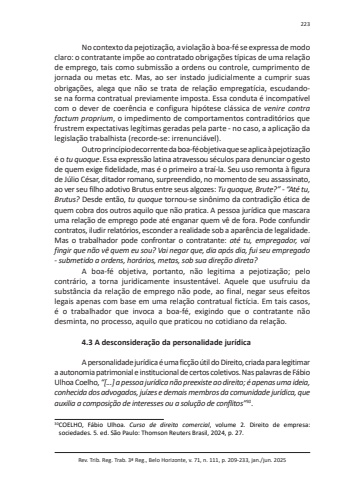 Rev. Trib. Reg. Trab. 3ª Reg., Belo Horizonte, v. 71, n. 111, p. 209-233, jan./jun. 2025223No contexto da pejotização, a violação à boa-fé se expressa de modo claro: o contratante impõe ao contratado obrigações típicas de uma relação de emprego, tais como submissão a ordens ou controle, cumprimento de jornada ou metas etc. Mas, ao ser instado judicialmente a cumprir suas obrigações, alega que não se trata de relação empregatícia, escudandose na forma contratual previamente imposta. Essa conduta é incompatível com o dever de coerência e configura hipótese clássica de venire contra factum proprium, o impedimento de comportamentos contraditórios que frustrem expectativas legítimas geradas pela parte - no caso, a aplicação da legislação trabalhista (recorde-se: irrenunciável).Outro princípio decorrente da boa-fé objetiva que se aplica à pejotização é o tu quoque. Essa expressão latina atravessou séculos para denunciar o gesto de quem exige fidelidade, mas é o primeiro a traí-la. Seu uso remonta à figura de Júlio César, ditador romano, surpreendido, no momento de seu assassinato, ao ver seu filho adotivo Brutus entre seus algozes: Tu quoque, Brute?” - “Até tu, Brutus? Desde então, tu quoque tornou-se sinônimo da contradição ética de quem cobra dos outros aquilo que não pratica. A pessoa jurídica que mascara uma relação de emprego pode até enganar quem vê de fora. Pode confundir contratos, iludir relatórios, esconder a realidade sob a aparência de legalidade. Mas o trabalhador pode confrontar o contratante: até tu, empregador, vai fingir que não vê quem eu sou? Vai negar que, dia após dia, fui seu empregado - submetido a ordens, horários, metas, sob sua direção direta?A boa-fé objetiva, portanto, não legitima a pejotização; pelo contrário, a torna juridicamente insustentável. Aquele que usufruiu da substância da relação de emprego não pode, ao final, negar seus efeitos legais apenas com base em uma relação contratual fictícia. Em tais casos, é o trabalhador que invoca a boa-fé, exigindo que o contratante não desminta, no processo, aquilo que praticou no cotidiano da relação.4.3 A desconsideração da personalidade jurídicaA personalidade jurídica é uma ficção útil do Direito, criada para legitimar a autonomia patrimonial e institucional de certos coletivos. Nas palavras de Fábio Ulhoa Coelho, “[...] a pessoa jurídica não preexiste ao direito; é apenas uma ideia, conhecida dos advogados, juízes e demais membros da comunidade jurídica, que auxilia a composição de interesses ou a solução de conflitos”30.30 COELHO, Fábio Ulhoa. Curso de direito comercial, volume 2. Direito de empresa: sociedades. 5. ed. São Paulo: Thomson Reuters Brasil, 2024, p. 27.
