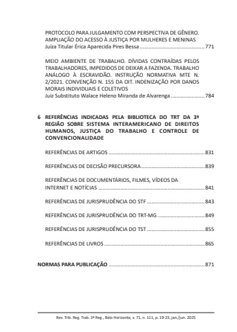 Rev. Trib. Reg. Trab. 3ª Reg., Belo Horizonte, v. 71, n. 111, p. 19-23, jan./jun. 2025PROTOCOLO PARA JULGAMENTO COM PERSPECTIVA DE GÊNERO. AMPLIAÇÃO DO ACESSO À JUSTIÇA POR MULHERES E MENINASJuíza Titular Érica Aparecida Pires Bessa ............................................771MEIO AMBIENTE DE TRABALHO. DÍVIDAS CONTRAÍDAS PELOS TRABALHADORES, IMPEDIDOS DE DEIXAR A FAZENDA. TRABALHO ANÁLOGO À ESCRAVIDÃO. INSTRUÇÃO NORMATIVA MTE N. 2/2021. CONVENÇÃO N. 155 DA OIT. INDENIZAÇÃO POR DANOS MORAIS INDIVIDUAIS E COLETIVOSJuiz Substituto Walace Heleno Miranda de Alvarenga .......................7846 REFERÊNCIAS INDICADAS PELA BIBLIOTECA DO TRT DA 3ª REGIÃO SOBRE SISTEMA INTERAMERICANO DE DIREITOS HUMANOS, JUSTIÇA DO TRABALHO E CONTROLE DE CONVENCIONALIDADEREFERÊNCIAS DE ARTIGOS .................................................................831REFERÊNCIAS DE DECISÃO PRECURSORA ...........................................839REFERÊNCIAS DE DOCUMENTÁRIOS, FILMES, VÍDEOS DAINTERNET E NOTÍCIAS ........................................................................841REFERÊNCIAS DE JURISPRUDÊNCIA DO STF .......................................843REFERÊNCIAS DE JURISPRUDÊNCIA DO TRT-MG ................................849REFERÊNCIAS DE JURISPRUDÊNCIA DO TST .......................................855REFERÊNCIAS DE LIVROS ....................................................................865NORMAS PARA PUBLICAÇÃO .................................................................871