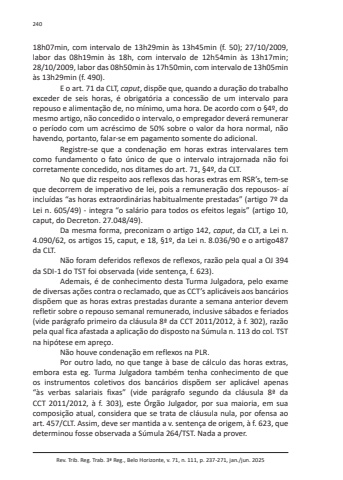 Rev. Trib. Reg. Trab. 3ª Reg., Belo Horizonte, v. 71, n. 111, p. 237-271, jan./jun. 202524018h07min, com intervalo de 13h29min às 13h45min (f. 50); 27/10/2009, labor das 08h19min às 18h, com intervalo de 12h54min às 13h17min; 28/10/2009, labor das 08h50min às 17h50min, com intervalo de 13h05min às 13h29min (f. 490).E o art. 71 da CLT, caput, dispõe que, quando a duração do trabalho exceder de seis horas, é obrigatória a concessão de um intervalo para repouso e alimentação de, no mínimo, uma hora. De acordo com o §4º, do mesmo artigo, não concedido o intervalo, o empregador deverá remunerar o período com um acréscimo de 50% sobre o valor da hora normal, não havendo, portanto, falar-se em pagamento somente do adicional.Registre-se que a condenação em horas extras intervalares tem como fundamento o fato único de que o intervalo intrajornada não foi corretamente concedido, nos ditames do art. 71, §4º, da CLT.No que diz respeito aos reflexos das horas extras em RSR’s, tem-se que decorrem de imperativo de lei, pois a remuneração dos repousos- aí incluídas “as horas extraordinárias habitualmente prestadas” (artigo 7º da Lei n. 605/49) - integra “o salário para todos os efeitos legais” (artigo 10, caput, do Decreton. 27.048/49).Da mesma forma, preconizam o artigo 142, caput, da CLT, a Lei n. 4.090/62, os artigos 15, caput, e 18, §1º, da Lei n. 8.036/90 e o artigo487 da CLT.Não foram deferidos reflexos de reflexos, razão pela qual a OJ 394 da SDI-1 do TST foi observada (vide sentença, f. 623).Ademais, é de conhecimento desta Turma Julgadora, pelo exame de diversas ações contra o reclamado, que as CCT’s aplicáveis aos bancários dispõem que as horas extras prestadas durante a semana anterior devem refletir sobre o repouso semanal remunerado, inclusive sábados e feriados (vide parágrafo primeiro da cláusula 8ª da CCT 2011/2012, à f. 302), razão pela qual fica afastada a aplicação do disposto na Súmula n. 113 do col. TST na hipótese em apreço.Não houve condenação em reflexos na PLR.Por outro lado, no que tange à base de cálculo das horas extras, embora esta eg. Turma Julgadora também tenha conhecimento de que os instrumentos coletivos dos bancários dispõem ser aplicável apenas “às verbas salariais fixas” (vide parágrafo segundo da cláusula 8ª da CCT 2011/2012, à f. 303), este Órgão Julgador, por sua maioria, em sua composição atual, considera que se trata de cláusula nula, por ofensa ao art. 457/CLT. Assim, deve ser mantida a v. sentença de origem, à f. 623, que determinou fosse observada a Súmula 264/TST. Nada a prover.