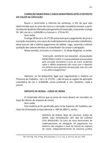 Rev. Trib. Reg. Trab. 3ª Reg., Belo Horizonte, v. 71, n. 111, p. 237-271, jan./jun. 2025241CORREÇÃO MONETÁRIA E JUROS MORATÓRIOS APÓS O DEPÓSITO DO VALOR DA EXECUÇÃOBusca o recorrente a reforma da sentença, a fim de que seja determinado que os juros de mora e a correção monetária cessem a partir da data do depósito efetuado para garantia da execução, invocando o artigo 9º, §4º, da Lei n. 6.830/80 e a Súmula n. 179 do STJ.Sem razão.O artigo 39 da Lei n. 8.177/91 prescreve que o pagamento de juros e correção monetária, nos casos de inadimplemento de parcelas trabalhistas, deve ocorrer até o efetivo pagamento do débito. Logo, somente a efetiva quitação dos valores devidos ao trabalhador faz cessar a obrigação.Nesse sentido, inclusive, é a Súmula n. 15 deste Regional, in verbis:“EXECUÇÃO. DEPÓSITO EM DINHEIRO. ATUALIZAÇÃO MONETÁRIA E JUROS. A responsabilidade do executado pela correção monetária e juros de mora incidentes sobre o débito exequendo não cessa com o depósito em dinheiro para garantia da execução, mas sim com o seu efetivo pagamento”.Ademais, se há dispositivo legal que regulamenta a matéria no Processo do Trabalho - Lei n. 8.177/91 -, não há que se cogitar da aplicação subsidiária da Lei n. 6.830/80, como pretende o réu. Destarte, nada a prover.IMPOSTO DE RENDA - JUROS DE MORAO reclamado afirma que os juros de mora devem ser incluídos na base de cálculo do imposto de renda.Sem razão.Esta matéria já foi pacificada pela Corte Superior do Trabalho, por meio da Orientação Jurisprudencial n. 400 da SBDI-1, verbis:IMPOSTO DE RENDA. BASE DE CÁLCULO. JUROS DE MORA. NÃO INTEGRAÇÃO. ART. 404 DO CÓDIGO CIVIL BRASILEIRO. Os juros de mora decorrentes do inadimplemento de obrigação de pagamento em dinheiro não integram a base de cálculo do imposto de renda, independentemente da natureza jurídica