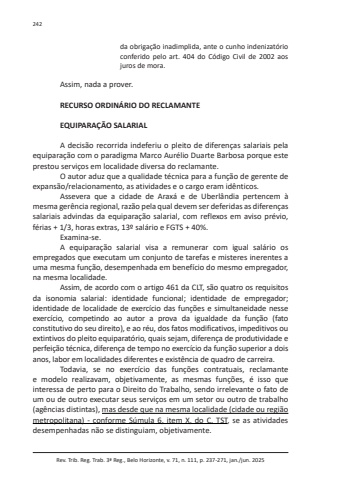 Rev. Trib. Reg. Trab. 3ª Reg., Belo Horizonte, v. 71, n. 111, p. 237-271, jan./jun. 2025242da obrigação inadimplida, ante o cunho indenizatório conferido pelo art. 404 do Código Civil de 2002 aos juros de mora.Assim, nada a prover.RECURSO ORDINÁRIO DO RECLAMANTEEQUIPARAÇÃO SALARIALA decisão recorrida indeferiu o pleito de diferenças salariais pela equiparação com o paradigma Marco Aurélio Duarte Barbosa porque este prestou serviços em localidade diversa do reclamante.O autor aduz que a qualidade técnica para a função de gerente de expansão/relacionamento, as atividades e o cargo eram idênticos.Assevera que a cidade de Araxá e de Uberlândia pertencem à mesma gerência regional, razão pela qual devem ser deferidas as diferenças salariais advindas da equiparação salarial, com reflexos em aviso prévio, férias + 1/3, horas extras, 13º salário e FGTS + 40%.Examina-se.A equiparação salarial visa a remunerar com igual salário os empregados que executam um conjunto de tarefas e misteres inerentes a uma mesma função, desempenhada em benefício do mesmo empregador, na mesma localidade.Assim, de acordo com o artigo 461 da CLT, são quatro os requisitos da isonomia salarial: identidade funcional; identidade de empregador; identidade de localidade de exercício das funções e simultaneidade nesse exercício, competindo ao autor a prova da igualdade da função (fato constitutivo do seu direito), e ao réu, dos fatos modificativos, impeditivos ou extintivos do pleito equiparatório, quais sejam, diferença de produtividade e perfeição técnica, diferença de tempo no exercício da função superior a dois anos, labor em localidades diferentes e existência de quadro de carreira.Todavia, se no exercício das funções contratuais, reclamante e modelo realizavam, objetivamente, as mesmas funções, é isso que interessa de perto para o Direito do Trabalho, sendo irrelevante o fato de um ou de outro executar seus serviços em um setor ou outro de trabalho (agências distintas), mas desde que na mesma localidade (cidade ou região metropolitana) - conforme Súmula 6, item X, do C. TST, se as atividades desempenhadas não se distinguiam, objetivamente.