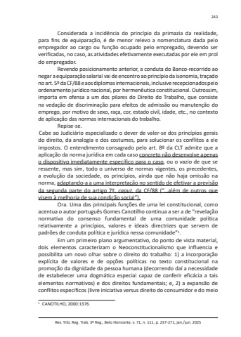 Rev. Trib. Reg. Trab. 3ª Reg., Belo Horizonte, v. 71, n. 111, p. 237-271, jan./jun. 2025243Considerada a incidência do princípio da primazia da realidade, para fins de equiparação, é de menor relevo a nomenclatura dada pelo empregador ao cargo ou função ocupado pelo empregado, devendo ser verificadas, no caso, as atividades efetivamente executadas por ele em prol do empregador.Revendo posicionamento anterior, a conduta do Banco-recorrido ao negar a equiparação salarial vai de encontro ao princípio da isonomia, traçado no art. 5º da CF/88 e aos diplomas internacionais, inclusive recepcionados pelo ordenamento jurídico nacional, por hermenêutica constitucional. Outrossim, importa em ofensa a um dos pilares do Direito do Trabalho, que consiste na vedação de discriminação para efeitos de admissão ou manutenção do emprego, por motivo de sexo, raça, cor, estado civil, idade, etc., no contexto de aplicação das normas internacionais do trabalho.Repise-se.Cabe ao Judiciário especializado o dever de valer-se dos princípios gerais do direito, da analogia e dos costumes, para solucionar os conflitos a ele impostos. O entendimento consagrado pelo art. 8º da CLT admite que a aplicação da norma jurídica em cada caso concreto não desenvolve apenas o dispositivo imediatamente específico para o caso, ou o vazio de que se ressente, mas sim, todo o universo de normas vigentes, os precedentes, a evolução da sociedade, os princípios, ainda que não haja omissão na norma, adaptando-a a uma interpretação no sentido de efetivar a previsão da segunda parte do artigo 7º, caput, da CF/88 (“...além de outros que visem à melhoria de sua condição social”).Ora. Uma das principais funções de uma lei constitucional, como acentua o autor português Gomes Canotilho continua a ser a de “revelação normativa do consenso fundamental de uma comunidade política relativamente a princípios, valores e ideais directrizes que servem de padrões de conduta política e jurídica nessa comunidade”1.Em um primeiro plano argumentativo, do ponto de vista material, dois elementos caracterizam o Neoconstitucionalismo que influencia e possibilita um novo olhar sobre o direito do trabalho: 1) a incorporação explícita de valores e de opções políticas no texto constitucional na promoção da dignidade da pessoa humana (decorrendo daí a necessidade de estabelecer uma dogmática especial capaz de conferir eficácia a tais elementos normativos) e dos direitos fundamentais; e, 2) a expansão de conflitos específicos (livre iniciativa versus direito do consumidor e do meio 1 CANOTILHO, 2000:1376.