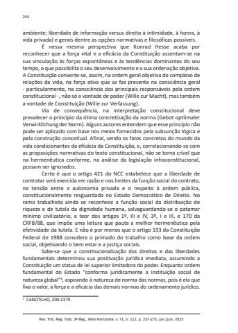 Rev. Trib. Reg. Trab. 3ª Reg., Belo Horizonte, v. 71, n. 111, p. 237-271, jan./jun. 2025244ambiente; liberdade de informação versus direito à intimidade, à honra, à vida privada) e gerais dentre as opções normativas e filosóficas possíveis.É nessa mesma perspectiva que Konrad Hesse acaba por reconhecer que a força vital e a eficácia da Constituição assentam-se na sua vinculação às forças espontâneas e às tendências dominantes do seu tempo, o que possibilita o seu desenvolvimento e a sua ordenação objetiva. A Constituição converte-se, assim, na ordem geral objetiva do complexo de relações da vida, na força ativa que se faz presente na consciência geral - particularmente, na consciência dos principais responsáveis pela ordem constitucional -, não só a vontade de poder (Wille zur Macht), mas também a vontade de Constituição (Wille zur Verfassung).Via de consequência, na interpretação constitucional deve prevalecer o princípio da ótima concretização da norma (Gebot optlimaler Verwirklichung der Norm). Alguns autores entendem que esse princípio não pode ser aplicado com base nos meios fornecidos pela subsunção lógica e pela construção conceitual. Afinal, sendo os fatos concretos do mundo da vida condicionantes da eficácia da Constituição, e, correlacionando-se com as proposições normativas do texto constitucional, não se torna crível que na hermenêutica conforme, na análise da legislação infraconstitucional, possam ser ignorados.Certo é que o artigo 421 do NCC estabelece que a liberdade de contratar será exercida em razão e nos limites da função social do contrato, na tensão entre a autonomia privada e o respeito à ordem pública, constitucionalmente resguardada no Estado Democrático de Direito. No ramo trabalhista ainda se reconhece a função social da distribuição de riqueza e de tutela da dignidade humana, salvaguardando-se o patamar mínimo civilizatório, a teor dos artigos 1º, III e IV, 3º, I e III, e 170 da CRFB/88, que impõe uma leitura que pauta a melhor hermenêutica pela efetividade da tutela. E não é por menos que o artigo 193 da Constituição Federal de 1988 considera o primado do trabalho como base da ordem social, objetivando o bem estar e a justiça sociais.Sabe-se que a constitucionalização dos direitos e das liberdades fundamentais determinou sua positivação jurídica imediata, assumindo a Constituição um status de lei superior limitadora do poder. Enquanto ordem fundamental do Estado “conforma juridicamente a instituição social de natureza global”Р, aspirando à natureza de norma das normas, pois é ela que fixa o valor, a força e a eficácia das demais normas do ordenamento jurídico.2 CANOTILHO, 200:1379.