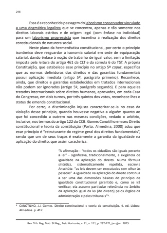Rev. Trib. Reg. Trab. 3ª Reg., Belo Horizonte, v. 71, n. 111, p. 237-271, jan./jun. 2025248Essa é a reconhecida passagem do laborismo conservador vinculado a uma dogmática legalista que se concentra, apenas e tão somente nos direitos laborais estritos e de origem legal (com ênfase no individual) para um laborismo progressista que incentiva a realização dos direitos constitucionais de natureza social.Neste plano da hermenêutica constitucional, por certo o princípio isonômico deve resguardar a isonomia salarial em sede de equiparação salarial, dando ênfase à noção de trabalho de igual valor, sem a limitação imposta pela leitura do artigo 461 da CLT e da súmula 6 do TST. A própria Constituição, que estabelece esse princípio no artigo 5º caput, especifica que as normas definidoras dos direitos e das garantias fundamentais possui aplicação imediata (artigo 5º, parágrafo primeiro). Reconhece, ainda, que direitos e garantias estabelecidos em tratados internacionais não podem ser ignorados (artigo 5º, parágrafo segundo). E para aqueles tratados internacionais sobre direitos humanos, aprovados, em cada Casa do Congresso, em dois turnos, por três quintos dos votos, reconhece-lhes o status de emenda constitucional.Por certo, a discriminação injusta caracterizar-se-ia no caso da violação desse princípio, quando houvesse negativa a alguém quanto ao que foi concedido a outrem nas mesmas condições, vedado o arbítrio, inclusive, nos termos do artigo 122 do CCB. Gomes Canotilho em seu Direito constitucional e teoria da constituição (Porto: Almedina, 2000) aduz que esse princípio é “estruturante do regime geral dos direitos fundamentais”, sendo que um de seus traços é exatamente a garantia da igualdade na aplicação do direito, que assim caracteriza:“A afirmação - “todos os cidadãos são iguais perante a lei” - significava, tradicionalmente, a exigência de igualdade na aplicação do direito. Numa fórmula sintética, sistematicamente repetida, escrevia Anschütz: “as leis devem ser executadas sem olhar às pessoas”. A igualdade na aplicação do direito continua a ser uma das dimensões básicas do princípio de igualdade constitucional garantido e, como se irá verificar, ela assume particular relevância no âmbito da aplicação igual da lei (do direito) pelos órgãos da administração e pelos tribunais”Ф.Ф CANOTILHO, J.J. Gomes. Direito constitucional e teoria da constituição. 4. ed. Lisboa: Almedina. p. 417.