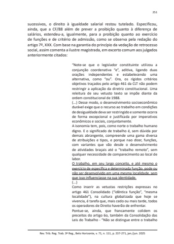 Rev. Trib. Reg. Trab. 3ª Reg., Belo Horizonte, v. 71, n. 111, p. 237-271, jan./jun. 2025251sucessivos, o direito à igualdade salarial restou tutelado. Especificou, ainda, que a CF/88 além de prever a proibição quanto à diferença de salários, estendeu-a, igualmente, para a proibição quanto ao exercício de funções e de critério de admissão, como se observa pela redação do artigo 7º, XXX. Com base na garantia do princípio da vedação de retrocesso social, assim comenta a ilustre magistrada, em excerto comum aos julgados anteriormente citados:“Note-se que o legislador constituinte utilizou a conjunção coordenativa “e”, aditiva, ligando duas orações independentes e estabelecendo uma alternativa, como “ou”. Ora, os rígidos critérios objetivos traçados pelo artigo 461 da CLT não podem restringir a aplicação da diretriz constitucional. Uma releitura de seu vetusto texto se impõe diante da ordem constitucional de 1988.(...) Desse modo, o desenvolvimento socioeconômico durável exige que o recurso ao trabalho em condições de desigualdade deva ser restringido e somente ocorra de forma excepcional e justificada por imperativos econômicos e sociais, conjuntamente.A isonomia tem, pois, como norte o trabalho humano digno. E o significado de trabalho é, sem dúvida por demais abrangente, compreende uma gama diversa de atribuições e tipos, e porque nao dizer, funções, com variantes que vão desde o desenvolvimento de atividades braçais até o “trabalho remoto”, sem qualquer necessidade de comparecimento ao local de labor.O trabalho, em seu largo conceito, e até mesmo o exercício de específica e determinada função, pode ou não ser desenvolvido em uma mesma localidade, sem que isso influenciasse na sua identidade.(...)Como inserir as vetustas restrições expressas no artigo 461 Consolidado (“idêntica função”, “mesma localidade”), na cultura globalizada que hoje se vivencia, é tarefa que, mais cedo ou mais tarde, todos os operadores de Direito haverão de enfrentar.Pontue-se, ainda, que francamente colidem os preceitos do artigo 6o, também da Consolidação das Leis do Trabalho - “Não se distingue entre o trabalho