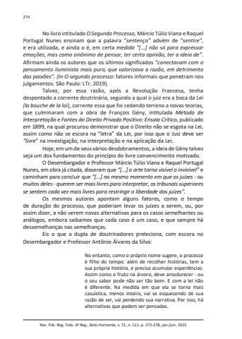 Rev. Trib. Reg. Trab. 3ª Reg., Belo Horizonte, v. 71, n. 111, p. 273-278, jan./jun. 2025274No livro intitulado O Segundo Processo, Márcio Túlio Viana e Raquel Portugal Nunes ensinam que a palavra “sentença” advém de “sentire”, e era utilizada, e ainda o é, em certa medida “[...] não só para expressar emoções, mas como sinônimo de pensar, ter certa opinião, ter a ideia de”.Afirmam ainda os autores que os últimos significados “conectavam com o pensamento iluminista mais puro, que valorizava a razão, em detrimento das paixões”. (In O segundo processo: fatores informais que penetram nos julgamentos. São Paulo: LTr, 2019).Talvez, por essa razão, após a Revolução Francesa, tenha despontado a corrente doutrinária, segundo a qual o juiz era a boca da Lei (la bouche de la loi), corrente essa que foi cedendo terreno a novas teorias, que culminaram com a obra de François Gény, intitulada Método de Interpretação e Fontes do Direito Privado Positivo: Ensaio Crítico, publicado em 1899, na qual procurou demonstrar que o Direito não se esgota na Lei, assim como não se escora na “letra” da Lei, por isso que o Juiz deve ser “livre” na investigação, na interpretação e na aplicação da Lei.Hoje, em um de seus vários desdobramentos, a ideia de Gény talvez seja um dos fundamentos do princípio do livre convencimento motivado.O Desembargador e Professor Márcio Túlio Viana e Raquel PortugalNunes, em obra já citada, disseram que “[...] a arte torna visível o invisível” e caminham para concluir que “[...] no mesmo momento em que os juízes - ou muitos deles - querem ser mais livres para interpretar, os tribunais superiores se sentem cada vez mais livres para restringir a liberdade dos juízes”.Os mesmos autores apontam alguns fatores, como o tempo de duração do processo, que poderiam levar os juízes a serem, ou, por assim dizer, a não verem novas alternativas para os casos semelhantes ou análogos, embora saibamos que cada caso é um caso, e que sempre há dessemelhanças nas semelhanças.Eis o que a dupla de doutrinadores preleciona, com escora no Desembargador e Professor Antônio Álvares da Silva:No entanto, como o próprio nome sugere, o processo é filho do tempo: além de recolher histórias, tem a sua própria história, e precisa acumular experiências. Assim como o fruto na árvore, deve amadurecer - ou o seu sabor pode não ser tão bom. E com a lei não é diferente. Na medida em que ela se torna mais casuística, menos inteira, vai se esquecendo de sua razão de ser, vai perdendo sua narrativa. Por isso, há alternativas que podem ser pensadas.