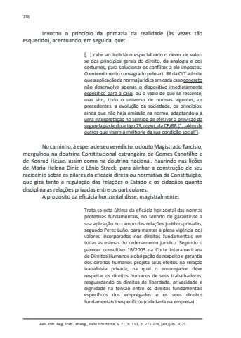 Rev. Trib. Reg. Trab. 3ª Reg., Belo Horizonte, v. 71, n. 111, p. 273-278, jan./jun. 2025276Invocou o princípio da primazia da realidade (às vezes tão esquecido), acentuando, em seguida, que:[...] cabe ao Judiciário especializado o dever de valerse dos princípios gerais do direito, da analogia e dos costumes, para solucionar os conflitos a ele impostos. O entendimento consagrado pelo art. 8º da CLT admite que a aplicação da norma jurídica em cada caso concreto não desenvolve apenas o dispositivo imediatamente específico para o caso, ou o vazio de que se ressente, mas sim, todo o universo de normas vigentes, os precedentes, a evolução da sociedade, os princípios, ainda que não haja omissão na norma, adaptando-a a uma interpretação no sentido de efetivar a previsão da segunda parte do artigo 7º, caput, da CF/88 (“...além de outros que visem à melhoria da sua condição social”). No caminho, à espera de seu veredicto, o douto Magistrado Tarcísio, mergulhou na doutrina Constitucional estrangeira de Gomes Canotilho e de Konrad Hesse, assim como na doutrina nacional, haurindo nas lições de Maria Helena Diniz e Lênio Streck, para alinhar a construção de seu raciocínio sobre os pilares da eficácia direta ou normativa da Constituição, que giza tanto a regulação das relações o Estado e os cidadãos quanto disciplina as relações privadas entre os particulares.A propósito da eficácia horizontal disse, magistralmente:Trata-se esta última da eficácia horizontal das normas protetivas fundamentais, no sentido de garantir-se a sua aplicação no campo das relações jurídico-privadas, segundo Perez Luño, para manter a plena vigência dos valores incorporados nos direitos fundamentais em todas as esferas do ordenamento jurídico. Segundo o parecer consultivo 18/2003 da Corte Interamericana de Direitos Humanos a obrigação de respeito e garantia dos direitos humanos projeta seus efeitos na relação trabalhista privada, na qual o empregador deve respeitar os direitos humanos de seus trabalhadores, resguardando os direitos de liberdade, privacidade e dignidade na tensão entre os direitos fundamentais específicos dos empregados e os seus direitos fundamentais inespecíficos (cidadania na empresa).