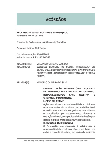 Rev. Trib. Reg. Trab. 3ª Reg., Belo Horizonte, v. 71, n. 111, p. 281-679, jan./jun. 2025281ACÓRDÃOSPROCESSO nº 0010013-07.2025.5.03.0056 (ROT)Publicado em 21.08.2025Tramitação Preferencial - Acidente de TrabalhoProcesso Judicial EletrônicoData da Autuação: 20/05/2025Valor da causa: R$ 2.347.760,62RECORRENTE: VALDINEIA CAITANO DA SILVARECORRIDO: WENDELL LEANDRO DE SOUZA, MINERAÇÃO DO BRASIL LTDA, COOPERATIVA REGIONAL GARIMPEIRA DE CORINTO LTDA - UNIQUARTZ, LUIS FERNANDO PEREIRA CHAVISRELATOR(A): MARCELO OLIVEIRA DA SILVAEMENTA: AÇÃO INDENIZATÓRIA. ACIDENTE DE TRABALHO EM ATIVIDADE DE GARIMPO. RESPONSABILIDADE CIVIL OBJETIVA E SUBJETIVA. PROCEDÊNCIA.I. CASO EM EXAMEAção que discute a responsabilidade civil dos réus em razão de acidente de trabalho fatal ocorrido em atividade de garimpo, que vitimou o trabalhador por soterramento, durante a extração mineral, com pedido de indenização por danos morais e materiais à viúva do falecido.II. QUESTÃO EM DISCUSSÃO2. A questão em discussão é estabelecer a responsabilidade civil dos réus, com base em culpa e risco da atividade, em razão da ausência