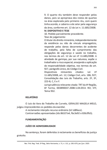 Rev. Trib. Reg. Trab. 3ª Reg., Belo Horizonte, v. 71, n. 111, p. 281-679, jan./jun. 20252839. O quarto réu também deve responder pelos danos, pois se apropriava dos restos de quartzo na área explorada pelo primeiro réu, com quem tinha acordo, e caberia a ele zelar pela segurança da área, conforme art. 12 da Lei n. 11.685/2008.IV. DISPOSITIVO E TESE10. Pedido parcialmente procedente.Tese de julgamento:O titular do direito minerário, independentemente da existência ou não de vínculo empregatício, responde pelos danos decorrentes de acidente de trabalho, pela falta de cumprimento das obrigações de segurança e saúde no trabalho, nos termos do art. 12 da Lei nº 11.685/2008. A atividade de garimpo, por sua natureza, expõe o trabalhador a risco especial, ensejando a aplicação da responsabilidade objetiva, nos termos do art. 927, parágrafo único, do Código Civil.Dispositivos relevantes citados: Lei nº 11.685/2008, art. 12; Código Civil, arts. 186, 927; Consolidação das Leis do Trabalho, arts. 2º, 3º, 223-B, C, E e F.Jurisprudência relevante citada: TRT da 4ª Região, 6ª Turma, 003890037.2008.5.04.0551 RO; STF, Tema 932.RELATÓRIOO Juiz da Vara do Trabalho de Curvelo, GERALDO MAGELA MELO, julgou improcedentes os pedidos da exordial.A reclamante interpôs recurso ordinário (Id 1d8face).Contrarrazões apresentadas (Ids 86327a4, fbc3e92 e 83b2fb5).FUNDAMENTAÇÃOJUÍZO DE ADMISSIBILIDADENa sentença, foram deferidos à reclamante os benefícios da justiça gratuita.