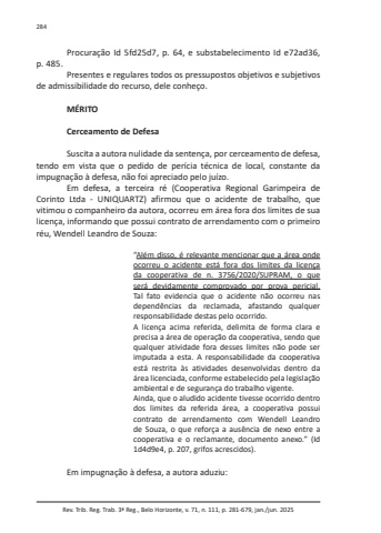 Rev. Trib. Reg. Trab. 3ª Reg., Belo Horizonte, v. 71, n. 111, p. 281-679, jan./jun. 2025284Procuração Id 5fd25d7, p. 64, e substabelecimento Id e72ad36, p. 485.Presentes e regulares todos os pressupostos objetivos e subjetivos de admissibilidade do recurso, dele conheço.MÉRITOCerceamento de DefesaSuscita a autora nulidade da sentença, por cerceamento de defesa, tendo em vista que o pedido de perícia técnica de local, constante da impugnação à defesa, não foi apreciado pelo juízo.Em defesa, a terceira ré (Cooperativa Regional Garimpeira de Corinto Ltda - UNIQUARTZ) afirmou que o acidente de trabalho, que vitimou o companheiro da autora, ocorreu em área fora dos limites de sua licença, informando que possui contrato de arrendamento com o primeiro réu, Wendell Leandro de Souza:“Além disso, é relevante mencionar que a área onde ocorreu o acidente está fora dos limites da licença da cooperativa de n. 3756/2020/SUPRAM, o que será devidamente comprovado por prova pericial. Tal fato evidencia que o acidente não ocorreu nas dependências da reclamada, afastando qualquer responsabilidade destas pelo ocorrido.A licença acima referida, delimita de forma clara e precisa a área de operação da cooperativa, sendo que qualquer atividade fora desses limites não pode ser imputada a esta. A responsabilidade da cooperativa está restrita às atividades desenvolvidas dentro da área licenciada, conforme estabelecido pela legislação ambiental e de segurança do trabalho vigente.Ainda, que o aludido acidente tivesse ocorrido dentro dos limites da referida área, a cooperativa possui contrato de arrendamento com Wendell Leandro de Souza, o que reforça a ausência de nexo entre a cooperativa e o reclamante, documento anexo.” (Id 1d4d9e4, p. 207, grifos acrescidos).Em impugnação à defesa, a autora aduziu: