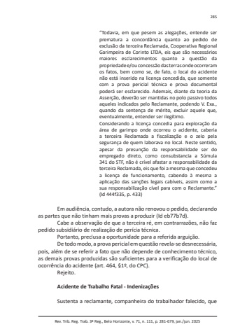 Rev. Trib. Reg. Trab. 3ª Reg., Belo Horizonte, v. 71, n. 111, p. 281-679, jan./jun. 2025285“Todavia, em que pesem as alegações, entende ser prematura a concordância quanto ao pedido de exclusão da terceira Reclamada, Cooperativa Regional Garimpeira de Corinto LTDA, eis que são necessários maiores esclarecimentos quanto a questão da propriedade e/ou concessão das terras onde ocorreram os fatos, bem como se, de fato, o local do acidente não está inserido na licença concedida, que somente com a prova pericial técnica e prova documental poderá ser esclarecido. Ademais, diante da teoria da Asserção, deverão ser mantidas no polo passivo todos aqueles indicados pelo Reclamante, podendo V. Exa., quando da sentença de mérito, excluir aquele que, eventualmente, entender ser ilegítimo.Considerando a licença concedia para exploração da área de garimpo onde ocorreu o acidente, caberia a terceira Reclamada a fiscalização e o zelo pela segurança de quem laborava no local. Neste sentido, apesar da presunção da responsabilidade ser do empregado direto, como consubstancia a Súmula 341 do STF, não é crível afastar a responsabilidade da terceira Reclamada, eis que foi a mesma que concedeu a licença de funcionamento, cabendo à mesma a aplicação das sanções legais cabíveis, assim como a sua responsabilização cível para com o Reclamante.” (Id 444f335, p. 433)Em audiência, contudo, a autora não renovou o pedido, declarando as partes que não tinham mais provas a produzir (Id eb77b7d).Cabe a observação de que a terceira ré, em contrarrazões, não faz pedido subsidiário de realização de perícia técnica.Portanto, preclusa a oportunidade para a referida arguição.De todo modo, a prova pericial em questão revela-se desnecessária, pois, além de se referir a fato que não depende de conhecimento técnico, as demais provas produzidas são suficientes para a verificação do local de ocorrência do acidente (art. 464, §1º, do CPC).Rejeito.Acidente de Trabalho Fatal - IndenizaçõesSustenta a reclamante, companheira do trabalhador falecido, que