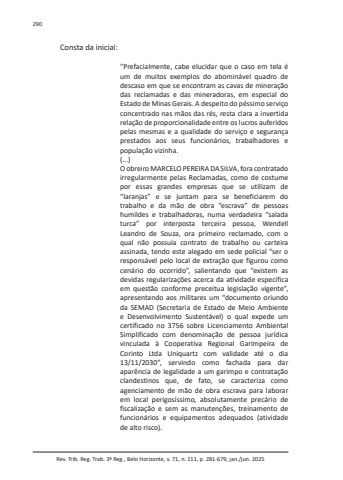 Rev. Trib. Reg. Trab. 3ª Reg., Belo Horizonte, v. 71, n. 111, p. 281-679, jan./jun. 2025290Consta da inicial:“Prefacialmente, cabe elucidar que o caso em tela é um de muitos exemplos do abominável quadro de descaso em que se encontram as cavas de mineração das reclamadas e das mineradoras, em especial do Estado de Minas Gerais. A despeito do péssimo serviço concentrado nas mãos das rés, resta clara a invertida relação de proporcionalidade entre os lucros auferidos pelas mesmas e a qualidade do serviço e segurança prestados aos seus funcionários, trabalhadores e população vizinha.(...)O obreiro MARCELO PEREIRA DA SILVA, fora contratado irregularmente pelas Reclamadas, como de costume por essas grandes empresas que se utilizam de “laranjas” e se juntam para se beneficiarem do trabalho e da mão de obra “escrava” de pessoas humildes e trabalhadoras, numa verdadeira “salada turca” por interposta terceira pessoa, Wendell Leandro de Souza, ora primeiro reclamado, com o qual não possuía contrato de trabalho ou carteira assinada, tendo este alegado em sede policial “ser o responsável pelo local de extração que figurou como cenário do ocorrido”, salientando que “existem as devidas regularizações acerca da atividade específica em questão conforme preceitua legislação vigente”, apresentando aos militares um “documento oriundo da SEMAD (Secretaria de Estado de Meio Ambiente e Desenvolvimento Sustentável) o qual expede um certificado no 3756 sobre Licenciamento Ambiental Simplificado com denominação de pessoa jurídica vinculada à Cooperativa Regional Garimpeira de Corinto Ltda Uniquartz com validade até o dia 13/11/2030”, servindo como fachada para dar aparência de legalidade a um garimpo e contratação clandestinos que, de fato, se caracteriza como agenciamento de mão de obra escrava para laborar em local perigosíssimo, absolutamente precário de fiscalização e sem as manutenções, treinamento de funcionários e equipamentos adequados (atividade de alto risco).